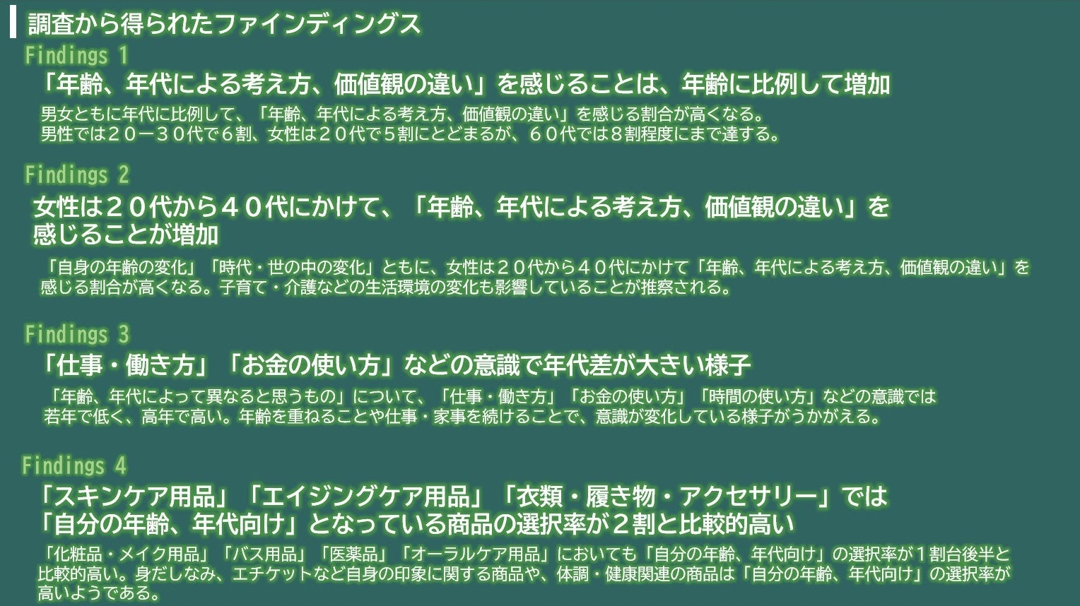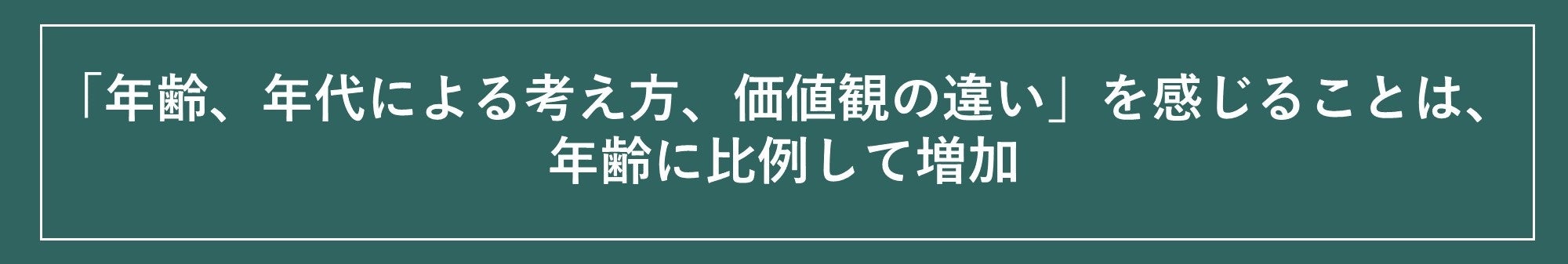 ここまで年齢、年代感による考え方、価値観の違いを見ていきましたが、年齢を重ねるにつれて価値観の違いを感じる割合が高く、仕事・子育て・介護生活など生活環境の変化が価値観の変化にも影響していることがわかりました。以上、 ~多様化する価値観を読み解く~年齢、年代感に関する調査を抜粋してお伝えしました。