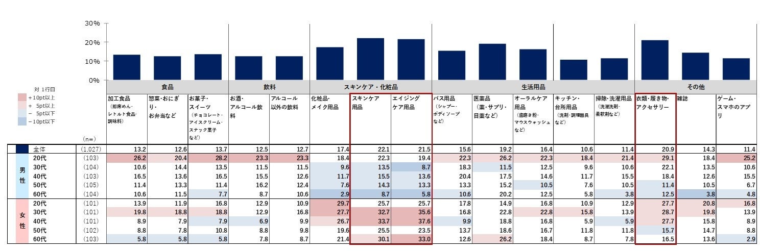 「スキンケア用品」「エイジングケア用品」「衣類・履き物・アクセサリー」では「自分の年齢、年代向け」となっている商品の選択率が2割と比較的高い「化粧品・メイク用品」「バス用品」「医薬品」「オーラルケア用品」においても「自分の年齢、年代向け」の選択率が1割台後半と比較的高い。身だしなみ、エチケットなど自身の印象に関する商品や、体調・健康関連の商品は「自分の年齢、年代向け」の選択率が高いようである。
