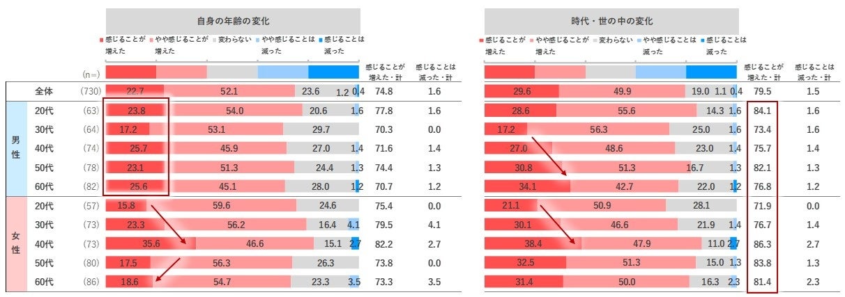 「自身の年齢の変化」による「年齢、年代による考え方、価値観の違い」を感じることについて、男性ではどの年代でも「感じることが増えた」の割合が一定なのに対し、女性では20代から40代にかけて高くなり、50-60代では低くなっています。「時代・世の中の変化」について、男性では「感じることが増えた」の割合は、30代以降では年代に比例して高くなっています。女性では「自身の年齢の変化」同様、20代から40代にかけて高くなり、50-60代では低くなる傾向です。