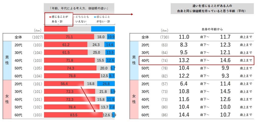 「年齢、年代による考え方、価値観の違い」を感じるのは全体で7割程度です。男女ともに年代に比例して「感じることがある・計」の割合が高い傾向がみられます。「自身と同じ価値観を持っていると思う年齢」を属性別で見ると、男性40代において年齢幅が最も広くなっています。仕事や私生活などで、幅広い年齢の人との交流がある様子が想像されます。20-30代では年下よりも年上と、60代では年上よりも年下と、それぞれ同じ考え方、価値観を持っていると認識している様子です。