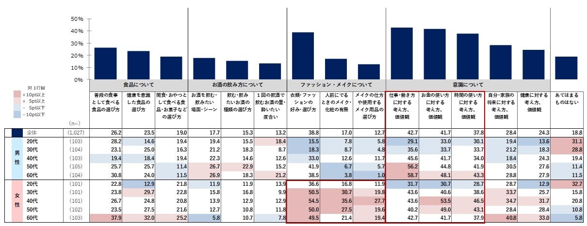 「仕事・働き方」「お金の使い方」が4割を超えてトップ2です。「衣類・ファッションの好み・選び方」「時間の使い方」が3割後半で続きます。「仕事・働き方」「お金の使い方」「時間の使い方」などの意識について、男女ともに若年では低く高年で高い傾向にあり、年齢とともに意識の変化がうかがえます。「衣類・ファッションの好み・選び方」を含め、ファッション・メイク関連では、主に女性で意識が異なる意識が高い傾向です。