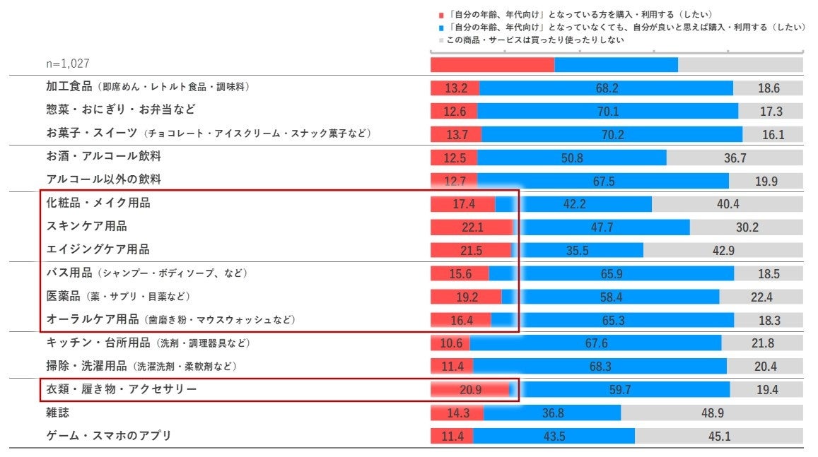 多くのカテゴリーで、「自分の年齢、年代向けとなっていなくても、自分が良いと思えば購入する」が半数以上を占める中で、「スキンケア商品」「エイジングケア商品」「衣類・履き物・アクセサリー」「化粧品・メイク用品」「バス用品」「医薬品」「オーラルケア用品」は2割前後で高めです。他人からの印象を意識するものや、自身の体調に直結するものは他項目に比べて「自分の年齢、年代向け」の商品を選ぶ様子がうかがえます。