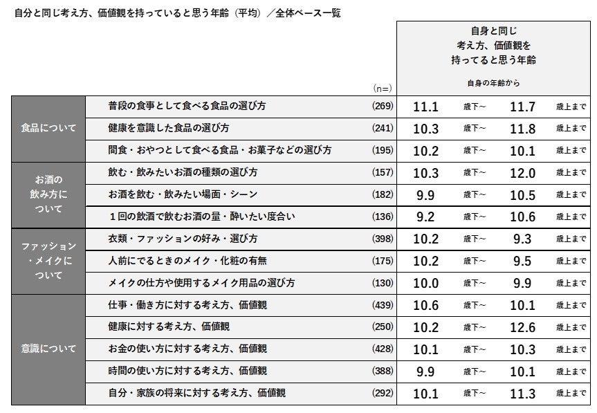 全体では、いずれの項目でも「自分と同じ考え方、価値観を持っていると思う年齢」は「10歳下~10歳上」程度となり、商品・サービス・意識によって大きな違いは確認されませんでした。