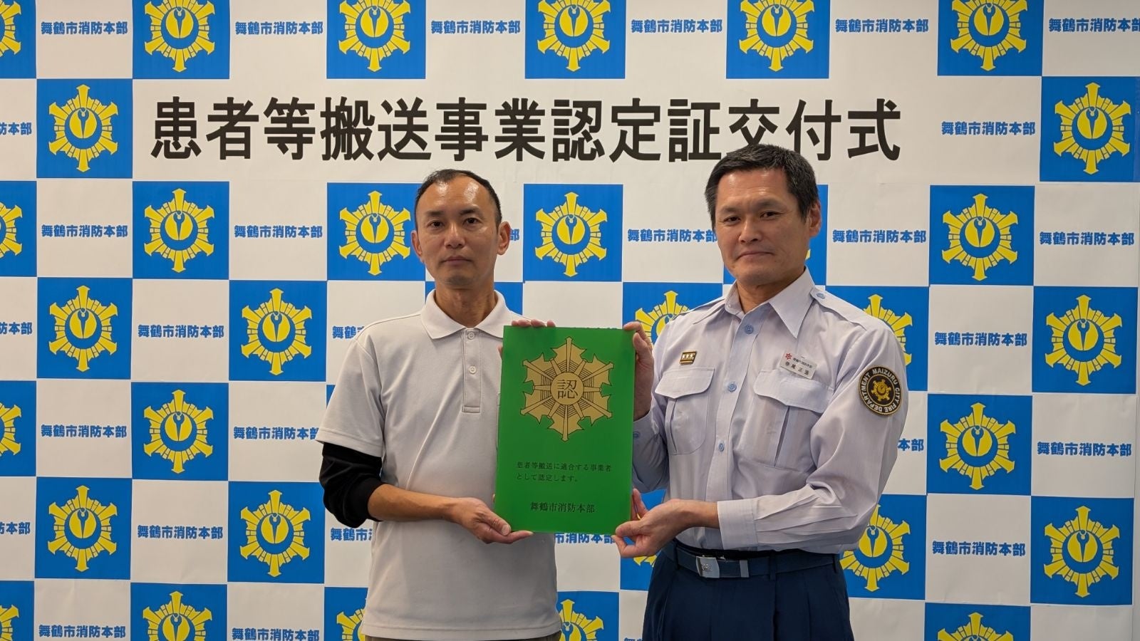 舞鶴市消防本部は、緊急性のなく、移動に介助が必要な人の入退院や通院など、市民の搬送ニーズに対応するため、市内の民間事業者「あのんケアタクシー」を患者等搬送事業者として初めて認定しました。
