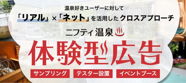 ニフティ温泉では、全国500施設以上(2022年8月時点)の加盟温浴施設とのネットワークを活かし、施設内での商品体験機会の提供に加え、国内最大規模の温泉・スパ情報専門サイトのメディア接点を利用し、温泉好きユーザーに対して”リアル×ネットを活用したクロスアプローチ”ができる体験型広告を提供しています。