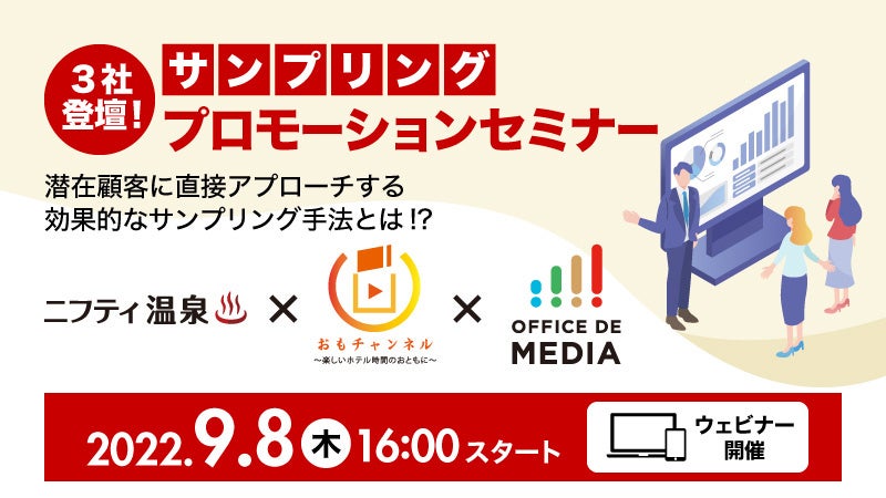 国内最大規模の温泉・スパ情報専門メディア「ニフティ温泉」を運営する、ニフティライフスタイル株式会社(本社:東京都新宿区、代表取締役社長:成田 隆志)は、株式会社ABCフロンティア(本社:東京都港区、代表取締役社長:後藤利一)、株式会社KOMPEITO(本社:東京都品川区、代表取締役社長:渡邉 瞬)と3社共催で、2022年9月8日(木)16時より、無料オンラインセミナー「体験型プロモーションセミナー~潜在顧客に直接アプローチする効果的なサンプリング手法とは!?」を開催いたします。