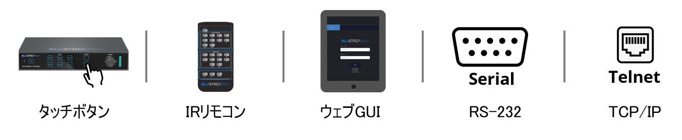 ■本体ボタン、IRリモコン、ウェブGUI、RS-232、TCP/IP経由制御