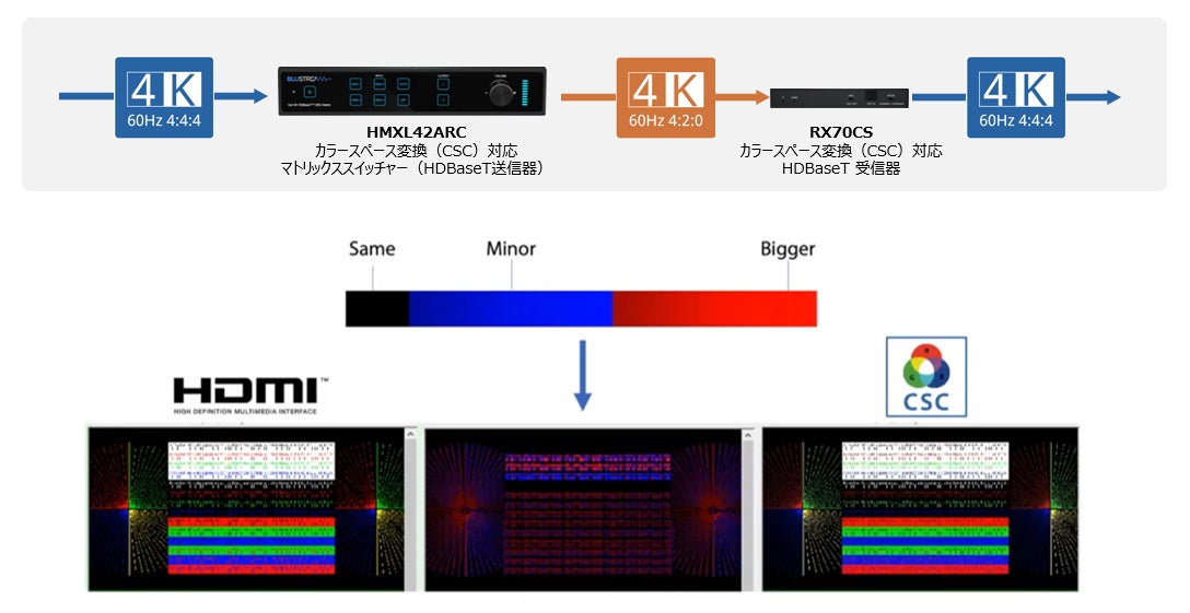 Blustream社では、4K HDR信号を技術的制限のあるHDBaseT規格にて伝送できるようカラースペース変換(CSC)技術をHDBaseT製品に実装しました。カラースペース変換では、4:4:4をクロマサブサンプリングすることでHDMI信号のデータレートを低減させ、ネイティブ解像度とフレームレートを一定に保ちます。受信器側で低データロスにて再変換処理を行い高画質なHDMI信号に変換出力します。
