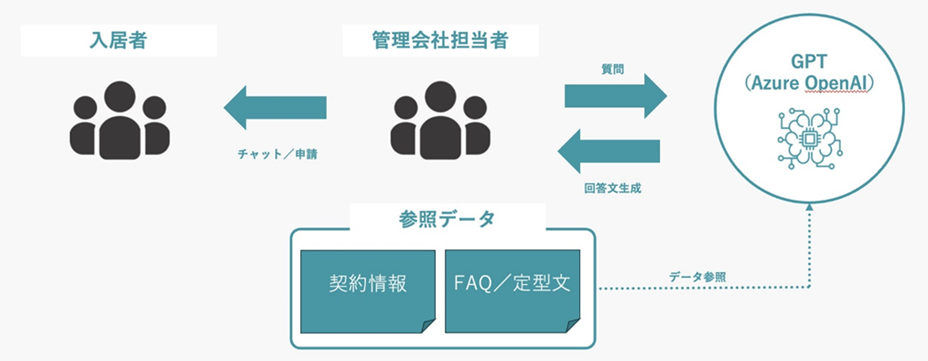 入居者アプリ「totono」は、2024年3月現在で100社を超える不動産管理会社にご契約いただいており、既に多くの管理会社で電話対応工数の大幅削減が実現できています。加えて、「totono」では入居者から届くチャット対応をいかにスムーズにできるかを重要視しており、案件の進捗管理機能やFAQのサジェスト、定型文の挿入等、多数の機能を提供しています。今回新たにChatGPTを組み込んだチャット対応効率化機能を「totono」に実装し、入居者からの問い合わせによりスムーズかつ正しい回答を作成できるよう検証を繰り返し、今回の機能リリースに至りました。