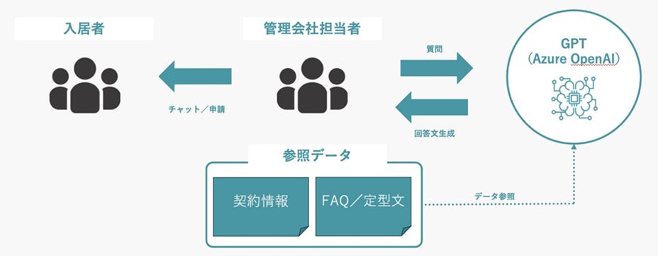 担当者は入居者からの問い合わせに関するあらゆる疑問を、AIサポート機能を通して質問することができます。また、AIサポート機能は問い合わせがあった入居者の契約情報を理解した上で回答を生成することができます。