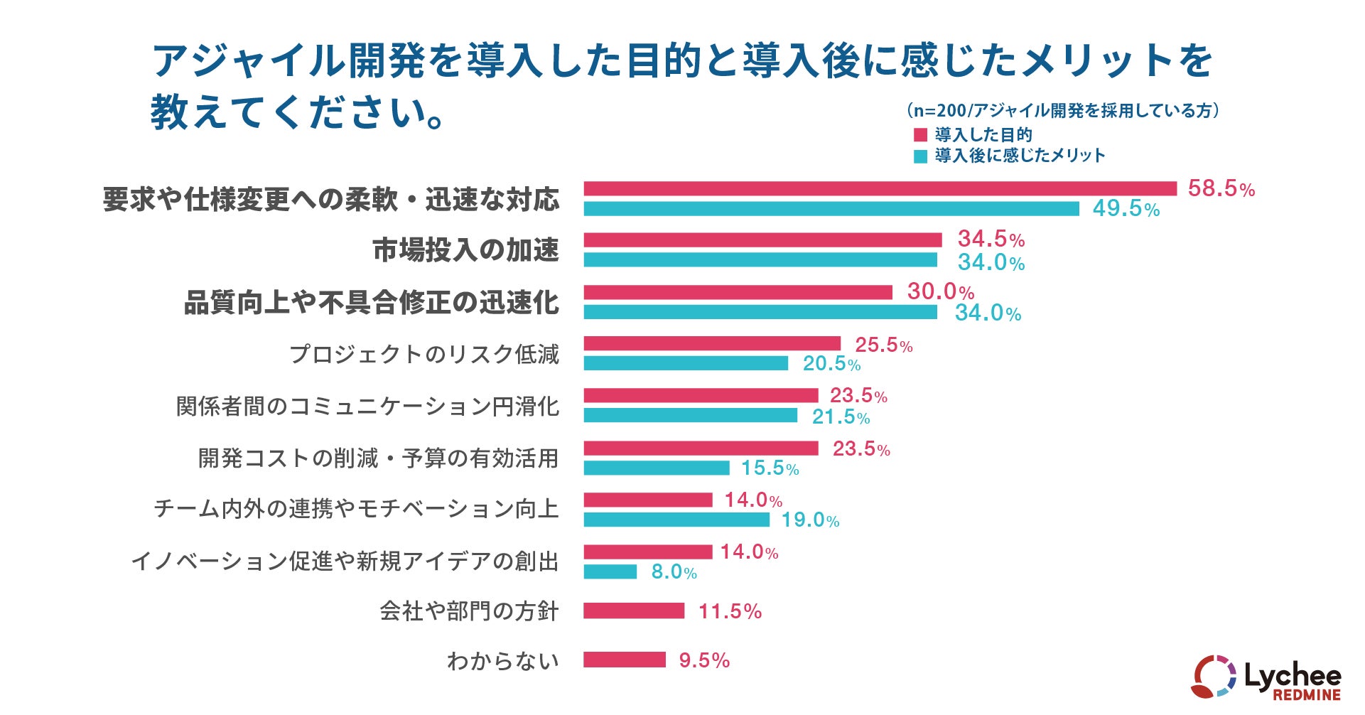 また、アジャイル開発に感じているメリットも、導入目的と同様に「要求や仕様変更への柔軟・迅速な対応」が最多となり、アジャイル開発の導入目的と実際のメリットには、ほとんどギャップがないことがわかりました(n=200/アジャイル開発を採用している方)。
