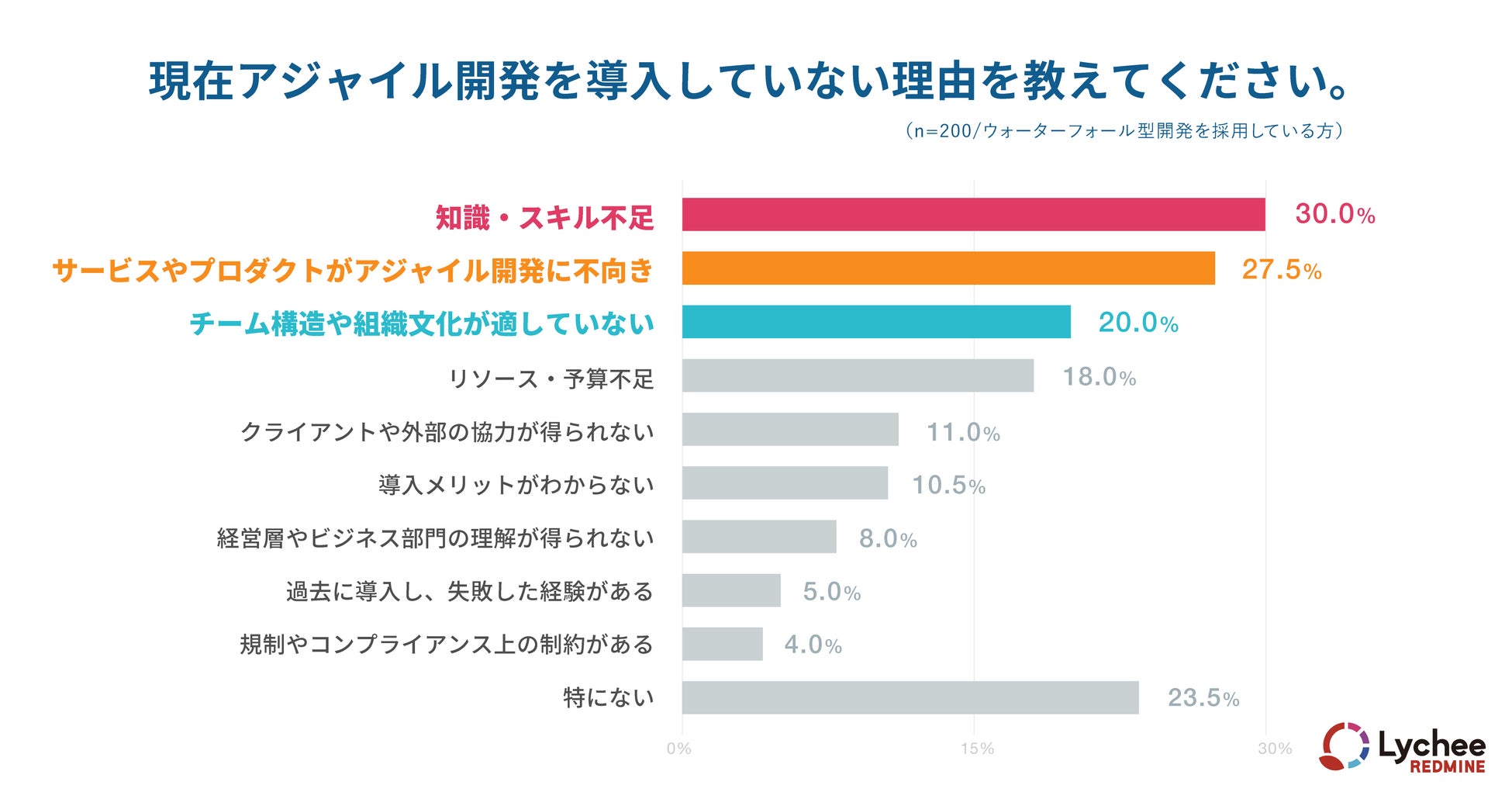 ウォーターフォール型開発を採用している方に、アジャイル開発を導入しない理由を尋ねたところ、「知識・スキル不足」が30.0%で最も多く、「サービスやプロダクトがアジャイル開発に不向き」が27.5%、「チーム構造や組織文化が適していない」が20.0%と続きました(n=200/ウォーターフォール型開発を採用している方)。