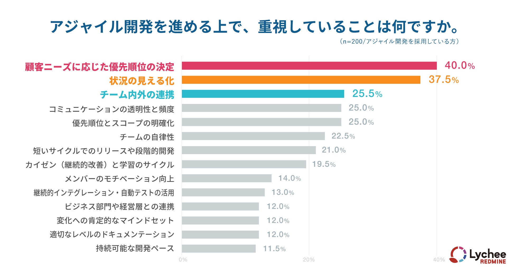 アジャイル開発を進める上で重視していることを尋ねたところ、「顧客ニーズに応じた優先順位の決定」が40.0%で最も多く、「状況の見える化」が37.5%、「チーム内外の連携」が25.5%と続きました(n=200/アジャイル開発を採用している方)。