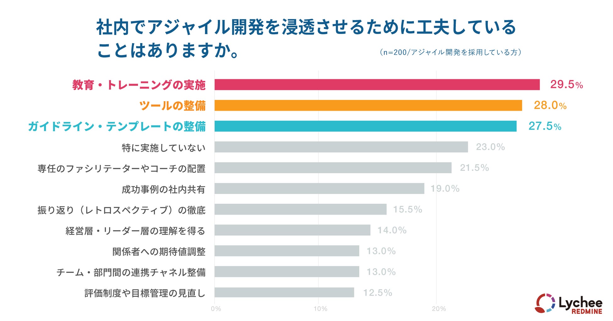 アジャイル開発を社内に浸透させるための工夫を尋ねたところ、「教育・トレーニングの実施」が29.5%で最も多く、「ツールの整備」が28.0%、「ガイドライン・テンプレートの整備」が27.5%と続きました。