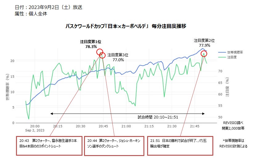 ご家庭に人体認識技術を搭載した機器を設置し、テレビスクリーンへの「注視」を測るREVISIO株式会社(旧TVISION INSIGHTS、本社:東京都千代田区、代表取締役社長 郡谷康士、以下REVISIO)は、9月2日(土)に地上波テレビ朝日系列で放送された、FIBAバスケットボールワールドカップ2023「日本×カーボベルデ」について、どのシーンが一番視られていたのか、毎分の注目度データを使って分析致しました。(注目度が高いことは、テレビの前の視聴者がくぎづけになったことを表します)
