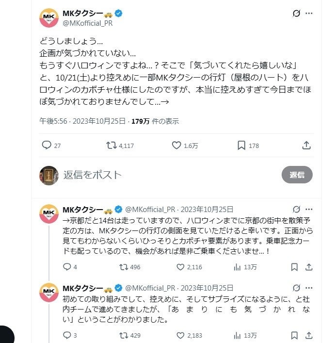 2023年に初めて登場した「ハロウィンタクシー」は、ハロウィンらしい“いたずら感”から、「気づく人だけ気づけば良い」というユニークなコンセプトでスタート。当初は行灯側面に小さなかぼちゃシールを貼るのみでしたが、あまりに気づかれず、公式Twitter(現X)で「どうしましょう…企画が気づかれていない…」と投稿したところ、170万インプレッション・1.5万件の「いいね」がつく大反響となりました。この投稿をきっかけに一部WEBマガジンでも取り上げられ注目を集めました。