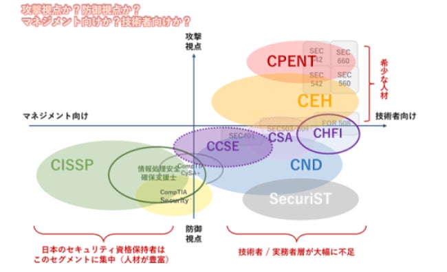 国内のセキュリティ資格保持者は「防御視点」かつ「マネジメント向け」エリアに集中しており、「技術者向け」かつ「攻撃視点」エリアにおける技術者や実務者層が大幅に不足しています。そのような市場環境を変えるべく、プラス・セキュリティ人材の育成にも注力しています。