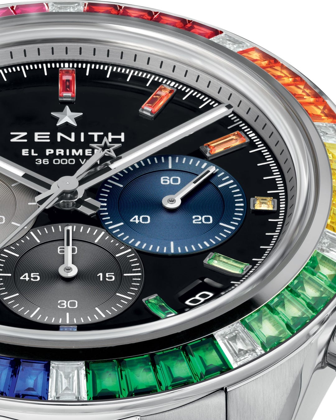 18Kホワイトゴールドで作られたラグジュアリーでカラフルな「クロノマスター スポーツ レインボー」は、昨年発表のローズゴールド製ケースにバゲットカットのダイヤモンド、スピネル、サファイアをあしらったモデルに続き、革新的な時計製造とジェムセッティングを融合するゼニスの技をいっそう鮮やかに物語ります。バランスのとれた41mmのケースは、ベゼルにバゲットカットのジェムストーン50個が「レインボー」スタイルでセットされています。タイムピースの機能性はそのままに、洗練されたスタイルを演出するのは、色鮮やかなパレットを披露する40個のサファイア(約3.9カラット)と、そのあいだに10秒のマーカーとしてあしらわれた10個のバゲットカットダイヤモンド(約1カラット)。この色彩のハーモニーは、ジェムセッティング技術とスタイルの唯一無二の出会いから生まれたものです。完全に均一なサイズ、カット、カラーのジェムストーンを集めることは、大きな挑戦となりました。