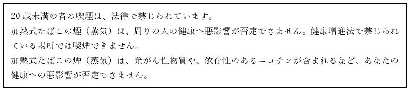 BATグループでは、たばこ製品のマーケティングを適切に実施するために国際的な自主規準を設定しています。そのため消費者に対するたばこ製品に関するすべてのコミュニケーションにおいては、20歳未満の方へのコミュニケーションをお控えいただくとともに、「喫煙と健康に関する注意文言」を表示することを関係各位にお願いしております。加熱式たばこに関しては、記事掲載していただく際には、「健康に関する注意文言」が表示されるようご配慮いただきたく存じます。ご協力の程、何卒よろしくお願い申し上げます。