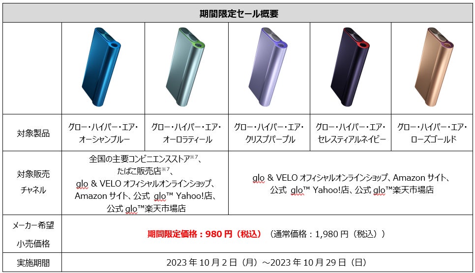この度のglo(TM) hyper用「ラッキー・ストライク」シリーズ新銘柄の発売に合わせ、お客様がglo(TM)デバイスをより手に入れやすくするため、最新デバイス「glo(TM) hyper air(グロー・ハイパー・エア)」を、メーカー希望小売価格1,980円(税込)のところ、特別価格980円(税込)で販売するキャンペーンを10月2日(月)から10月29日(日)の期間限定で実施します。(※5)