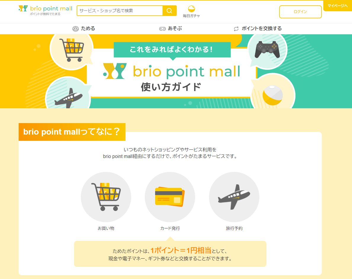「brio point mall」では、本サイトを経由して提携先のECサイトに遷移後に商品・サービスを購入してくださったお客様に対し、その購入先サイトでの購入価格などに応じて、独自のポイントを付与いたします。1ポイント=1円換算(有効期限1年間)で、一定のポイント数より、現金・電子マネー・ギフトカードとの交換など、様々なサービスを受けることができます。