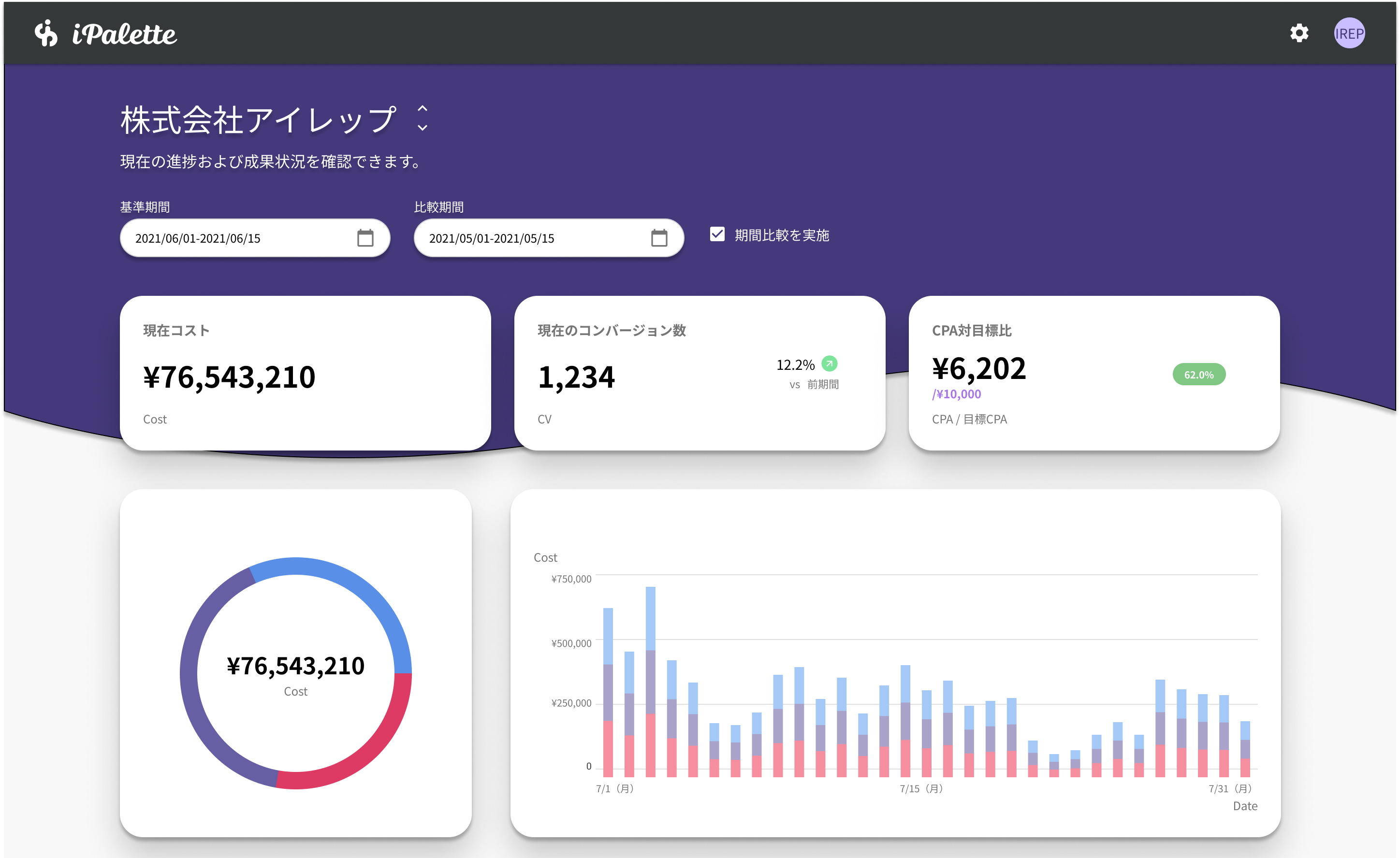 当社では、このような状況に迅速に対応すべく、クライアント企業とともに広告配信にまつわるコミュニケーションを一元的に管理し、連携できるプラットフォーム「iPalette」の開発・提供を開始しました。今回は開発の第一弾として、広告の運用実績を提供するBI機能を搭載しました。このBI機能により、クライアント企業は運用実績における各データを統合してリアルタイムで可視化することができ、常にモニタリングしたい事業上の重要指標( KPI達成状況、予算進捗状況など)をWeb上でいつでもモニタリング・抽出できるようになります。これにより現状の把握がしやすく、双方のコミュニケーションの円滑化が進み、ベストなタイミングでの意見交換をおこなうなどの協創力の向上が実現します。また、クライアント企業のおける意思決定力の質やスピードを高めることで、広告運用の効率化を図ります。