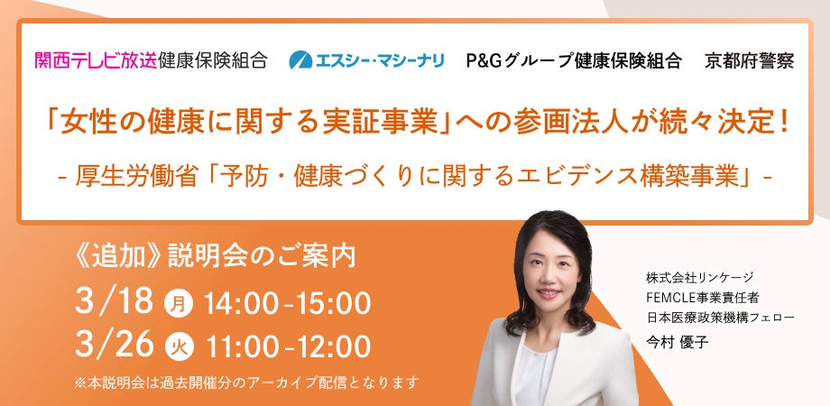 リンケージでは、当実証事業にご参画いただける企業を募集しています。実証事業へのご参画や「FEMCLE」の詳細について、以下のとおりオンラインでの説明会を追加開催いたしますので、ご興味のある方はお申込みをお願いいたします。