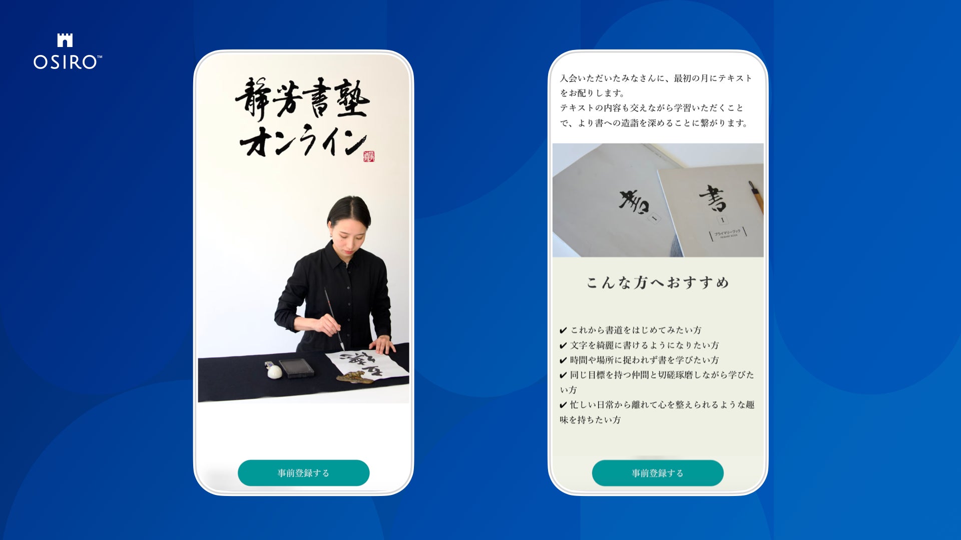 コミュニティ専用オウンドプラットフォーム「OSIRO」を提供するオシロ株式会社(本社:東京都渋谷区、代表取締役社長:杉山 博一、以下 オシロ)は、書道家の大江静芳さん(以下 大江さん)に「OSIRO」の提供を開始しました。大江さんは2025年3月1日オンラインコミュニティ「静芳書塾オンライン」をオープン。それに伴い、2025年2月16日よりコミュニティメンバー1期生の入会募集を開始しました。