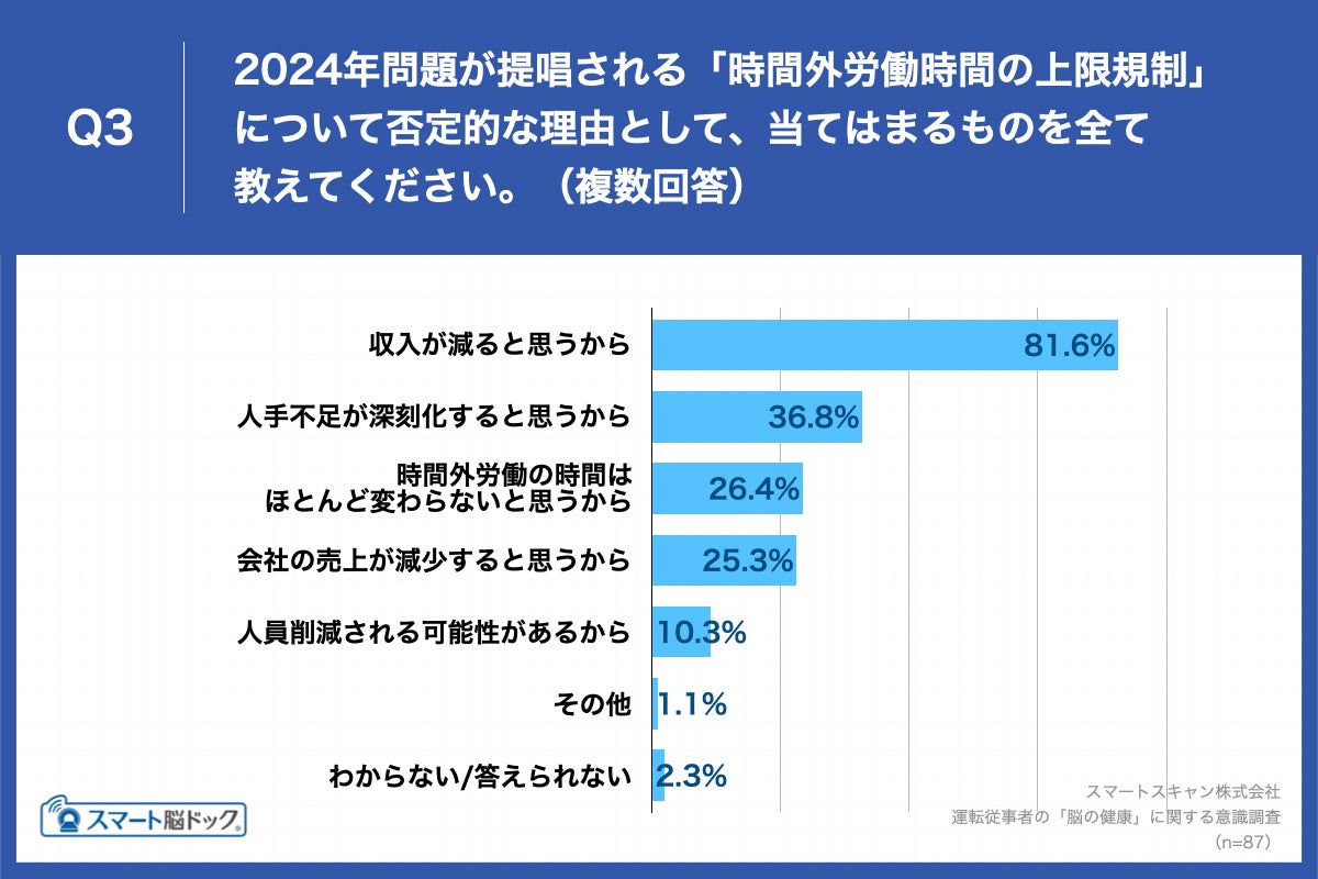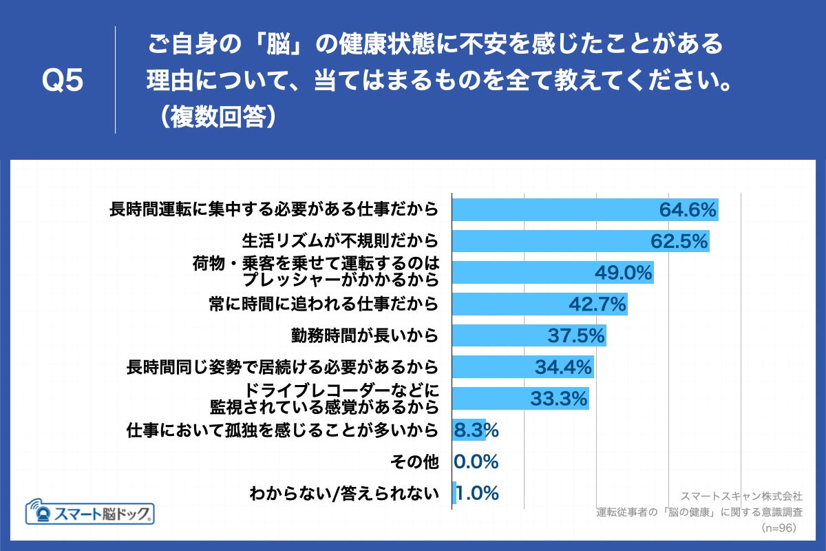 - 脳に不安のある理由として、6割以上が「長時間運転に集中する必要がある仕事だから」や「生活リズムが不規則だから」と回答