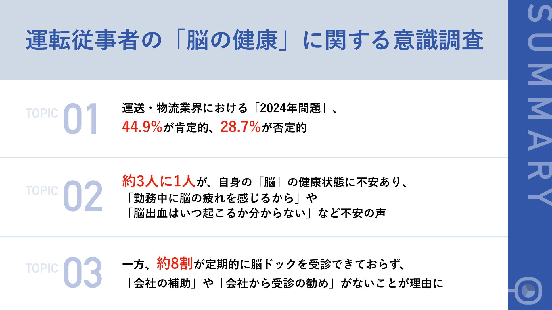 働き方の改善に期待が高まる中で、長時間の集中が求められる運転従事者に自身の「脳」の健康状態に関して伺うと、約3人に1人が「勤務中に脳の疲れを感じる」や「脳出血はいつ起こるか分からない」などで不安を抱える実態が浮き彫りとなりました。