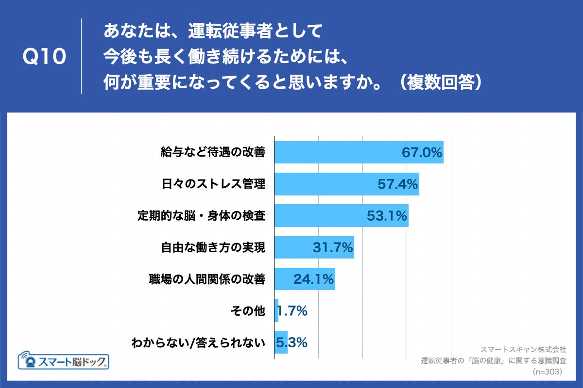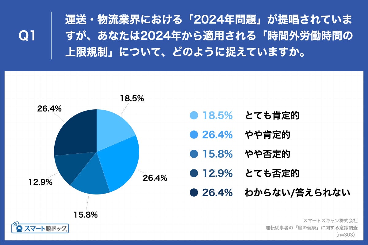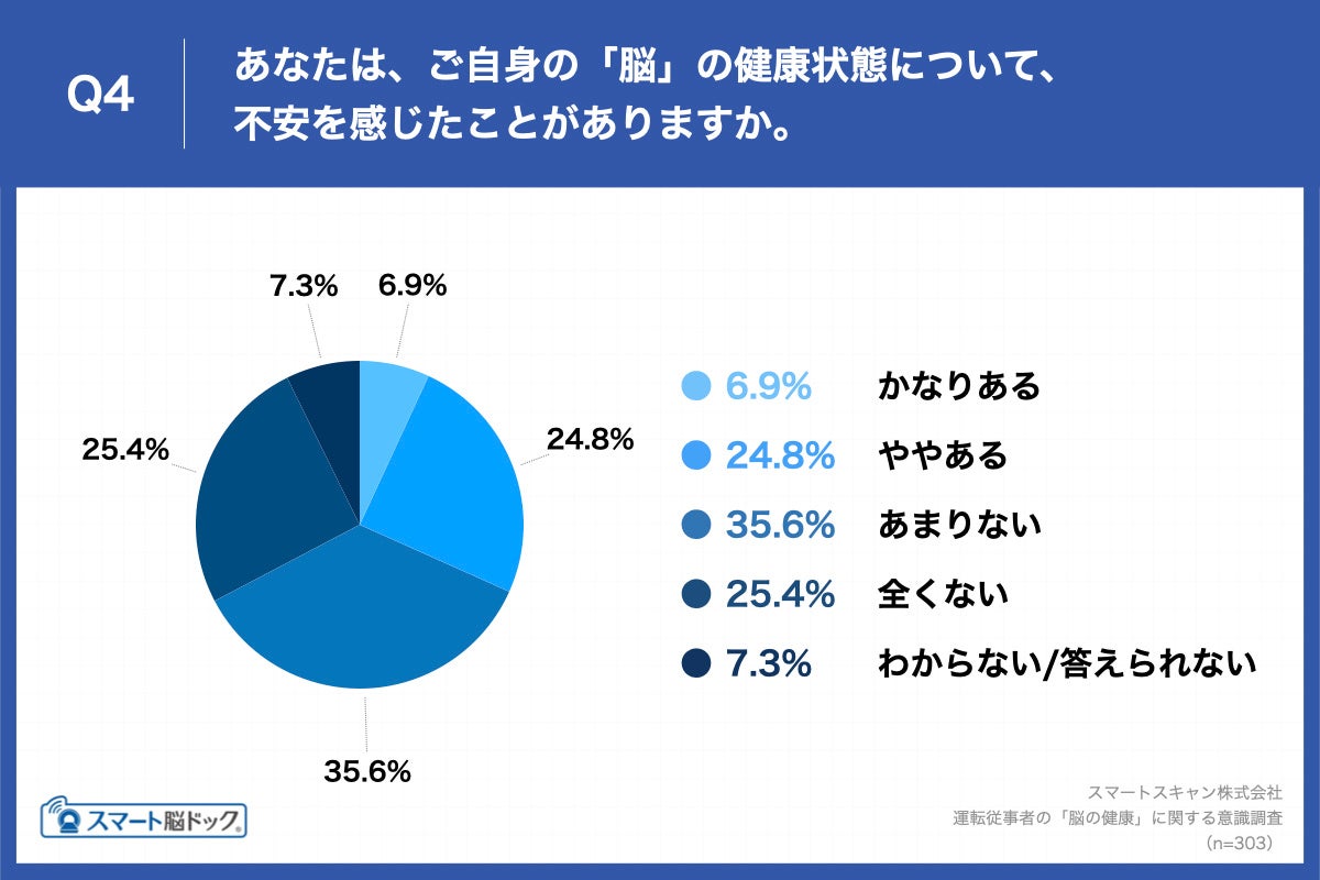 病院やクリニックのDX推進をサポートするスマートスキャン株式会社(本社:東京都中央区、代表取締役:濱野斗百礼、以下、スマートスキャン)は、運転従事者(トラック/タクシー/バスのドライバー)303名に対し、「脳の健康」に関する意識調査を実施いたしましたので、お知らせいたします。