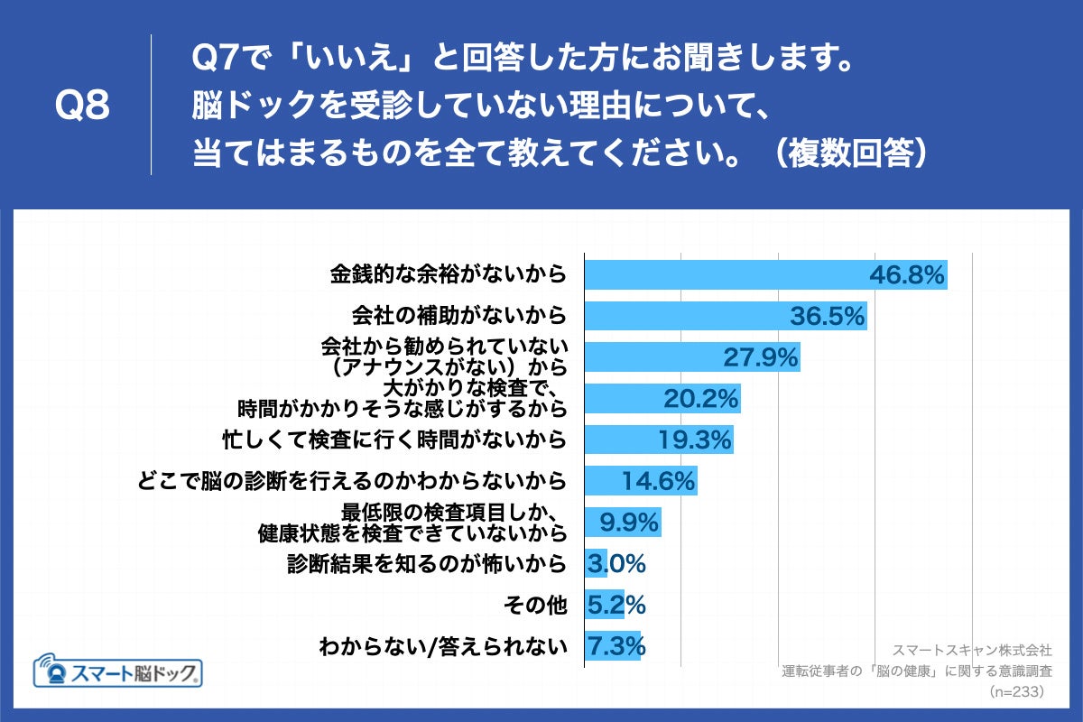 - 脳ドックを受診していないのは、「金銭面」や「会社の補助・勧めがないこと」などが理由に