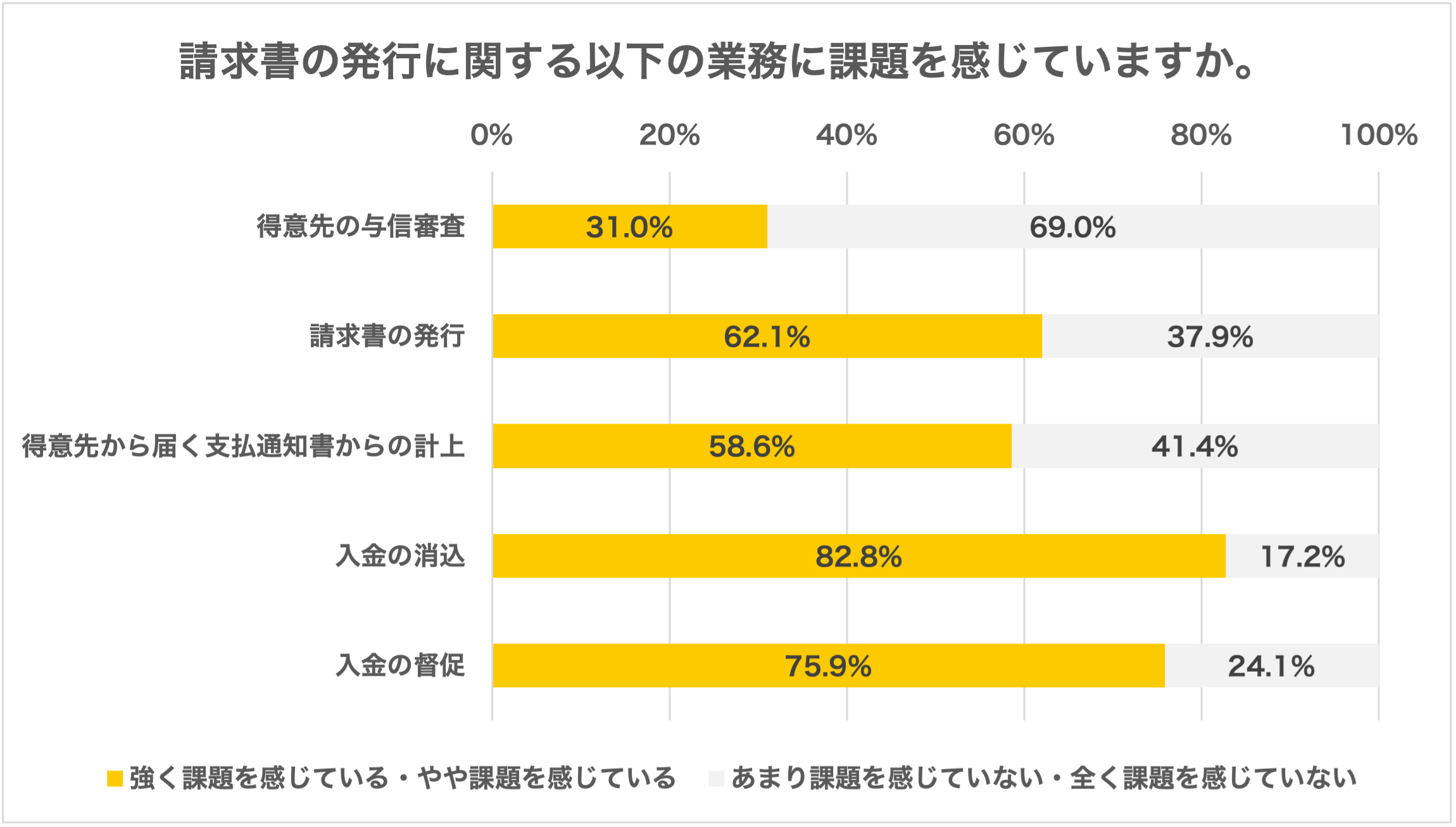 株式会社invoxが行った調査(※3)によると、62.1%の経理担当者が請求書の発行に課題を感じ、とりわけ請求書を発行した後の入金の消込には82.8%と大半の経理担当者が課題を感じています。