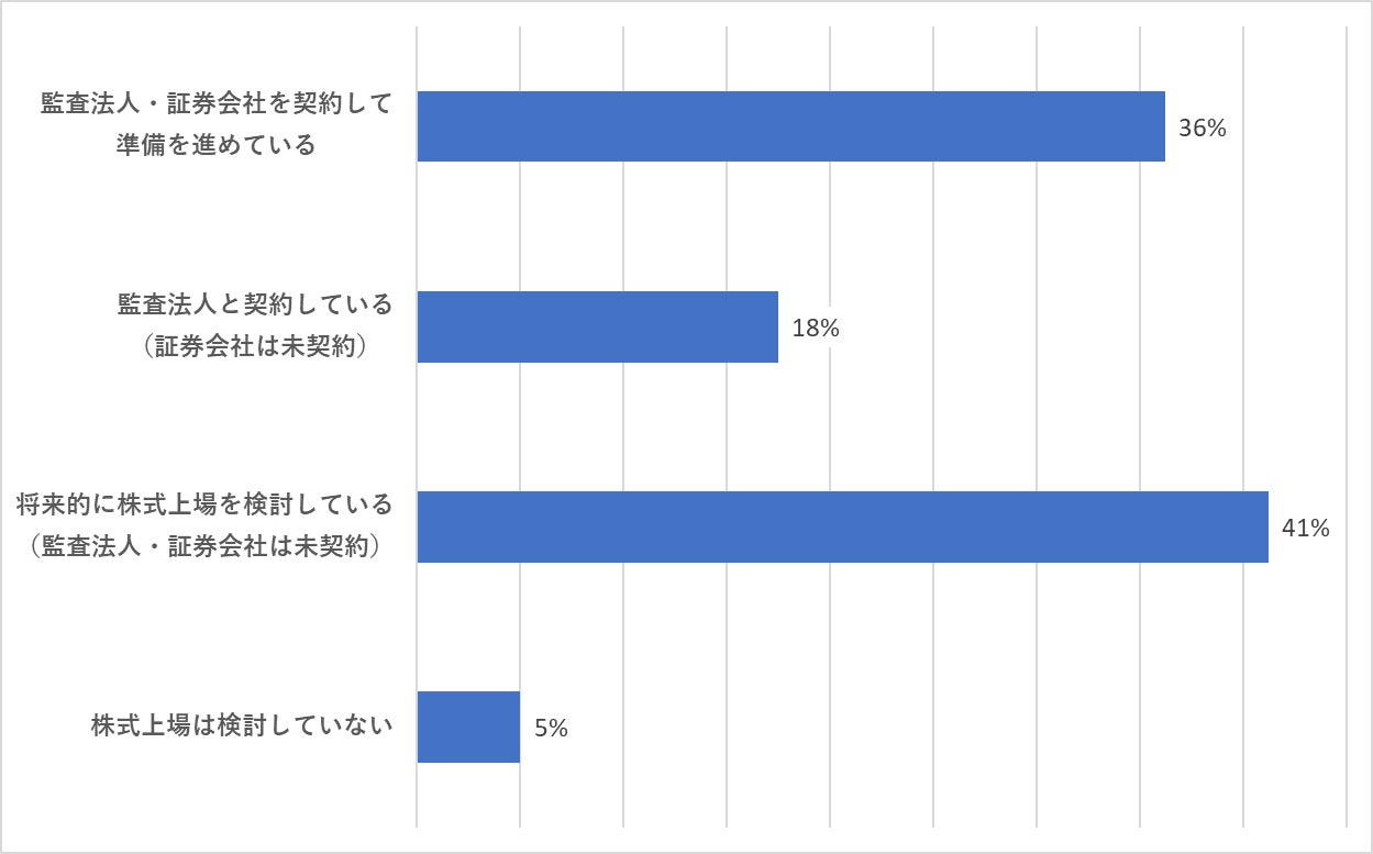 監査法人や証券会社などと契約をして上場準備を始めていると回答したのは54%、将来的に株式上場を検討していると回答したのは41%となりました。