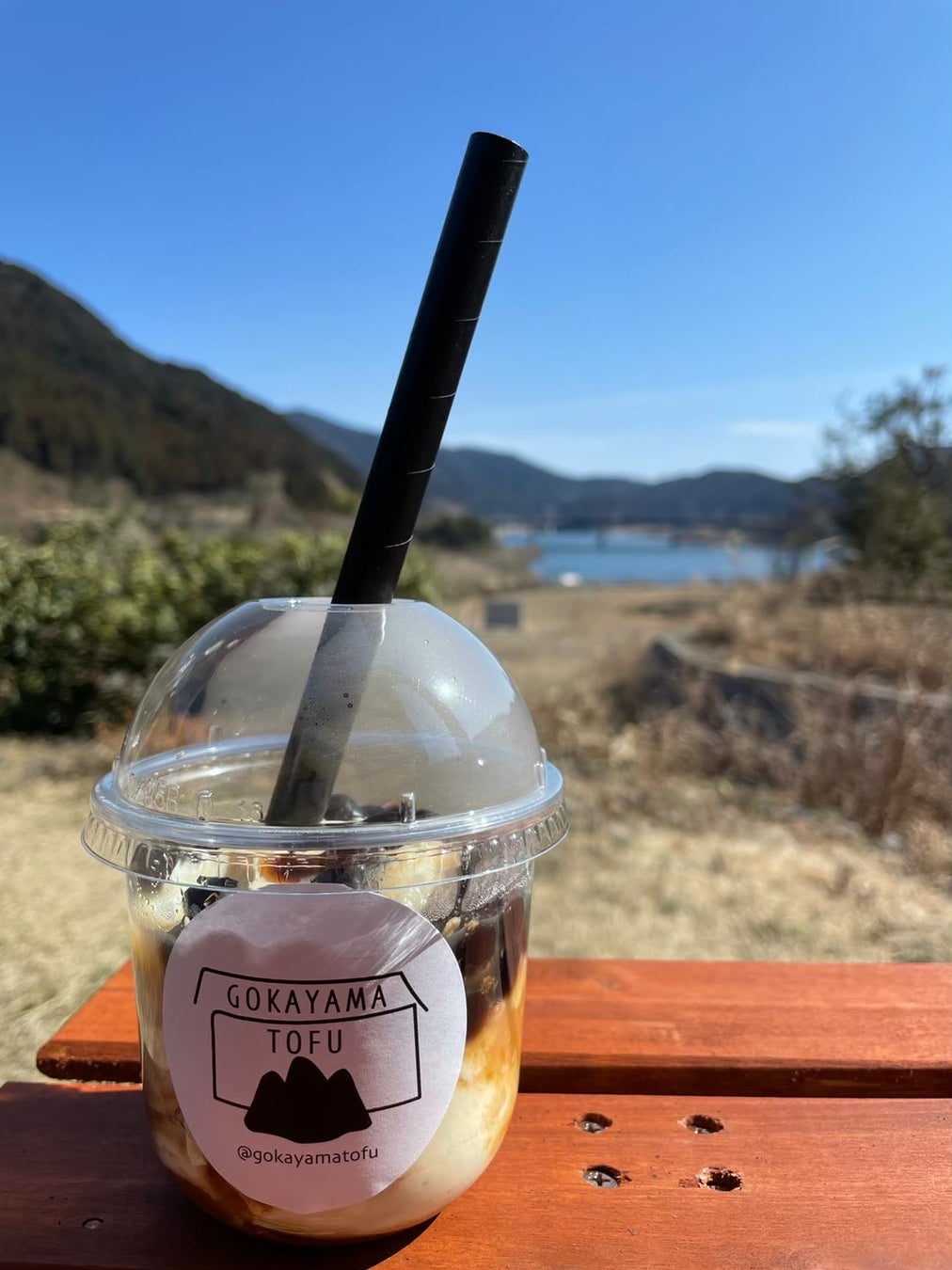 発売以来、SNSを中心に火が付き、タホを求めるお客様が続々来店。タホを片手に、五ケ山ダムに向かって「ヤッホー!」ならぬ「タッホー!」と叫び出す方も出現し、とうとう五ケ山豆腐店舗の屋外テラスに、「五ケ山の中心で「タッホー」を叫ぶ」撮影専用スポットを特設しました。