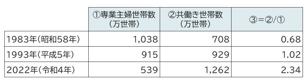 総務省の統計データをみると【図表3】、40年前(1983年)の共働き世帯数は専業主婦世帯数の約7割でしたが、30年前(1993年)に初めて専業主婦世帯数を上回り、直近2022年では1,262万世帯と専業主婦世帯数の2.3倍に達しています。