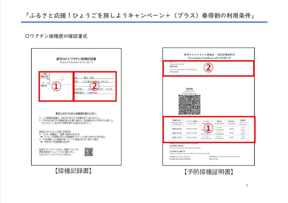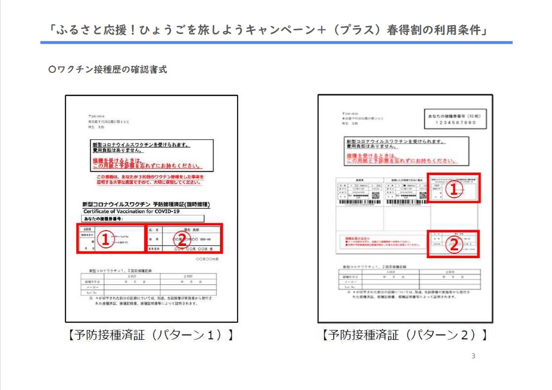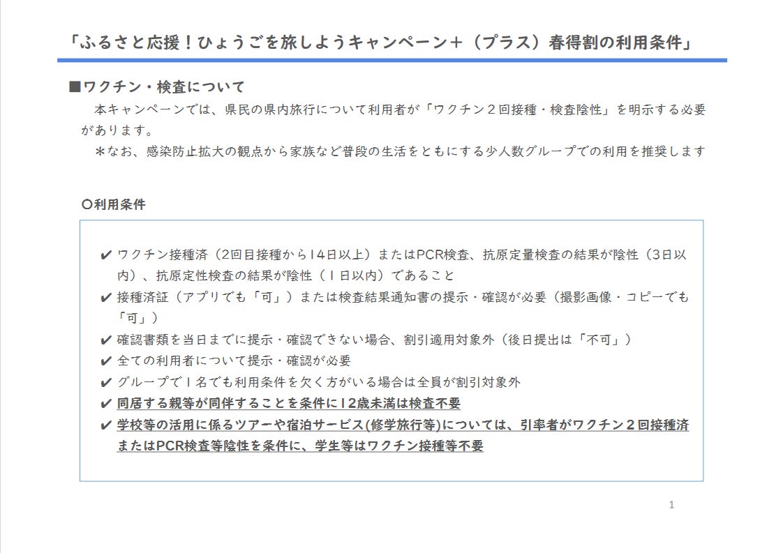 接種済証またはPCR検査等結果通知書(撮影画像、コピー、電子的な証明書でも可)の確認は、同行者も含めて旅行者全員について実施しますので、チェックイン時(旅行会社の場合は予約証明書等お渡しの来店時)にご提示ください。提示のない場合は割引支援を受けることができません。