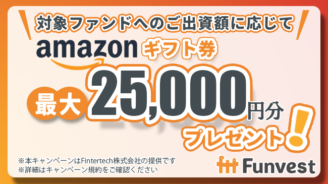 また、本ファンドへの出資額に応じて最大25,000円分のAmazonギフト券をプレゼントするキャンペーンを併せて実施いたします。