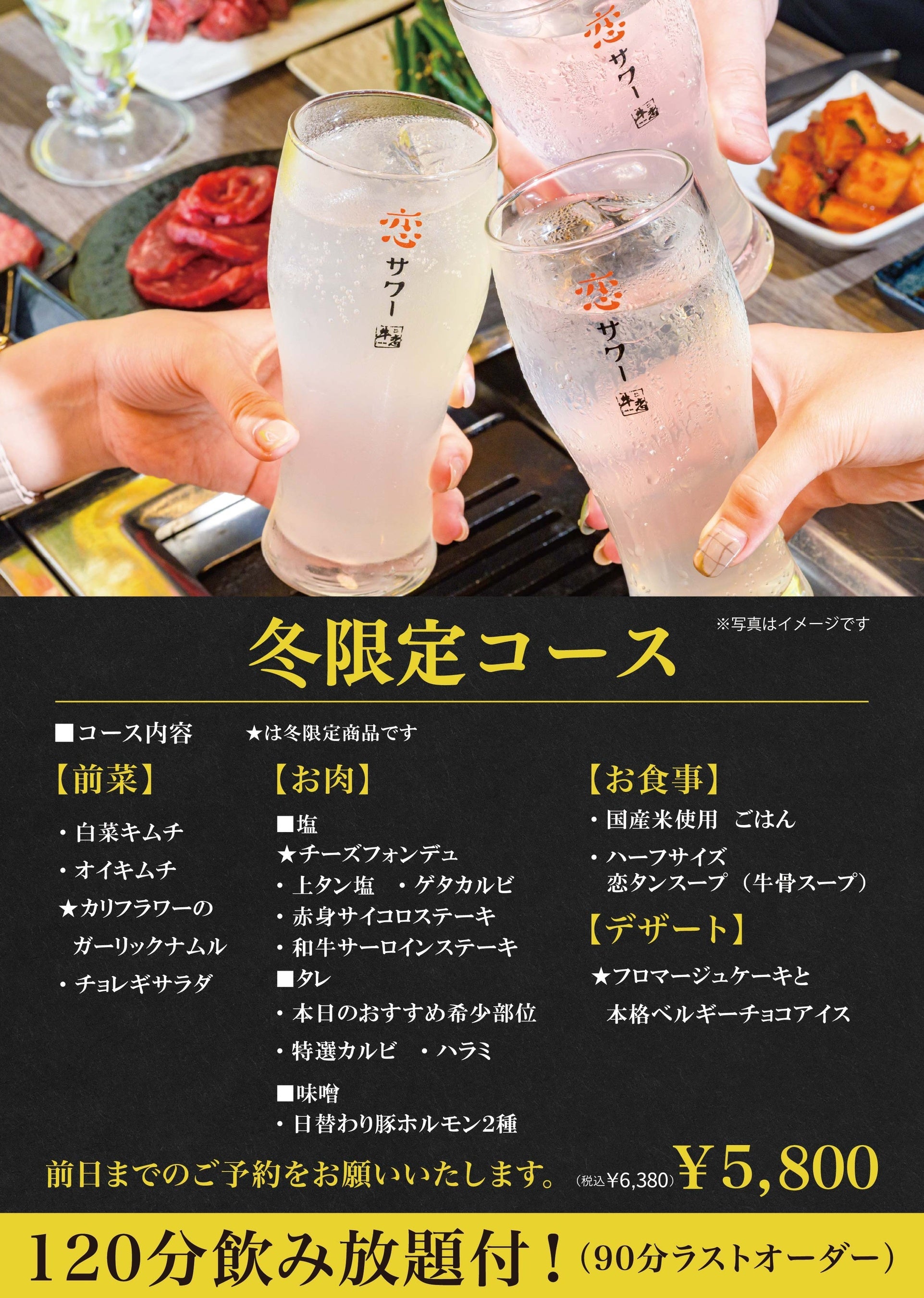 さらに、120分飲み放題付きの『冬限定コース』5,800円(税込6,380円)も同日より提供を開始いたします。全17品のコースには、定番の人気商品や希少部位に加え、今だけ味わえる冬限定商品も含まれており、忘年会・新年会などグループでのご利用にも自信をもっておすすめできる内容となっております。