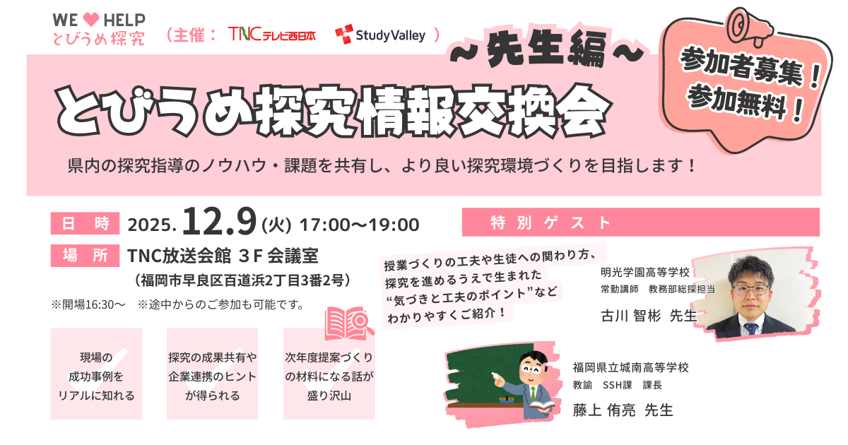 株式会社Study Valleyと株式会社テレビ西日本は、2025年12月9日(火)に、福岡市のTNC放送会館にて、福岡県内の教員向けイベント「とびうめ探究情報交換会~先生編~」を開催いたします。