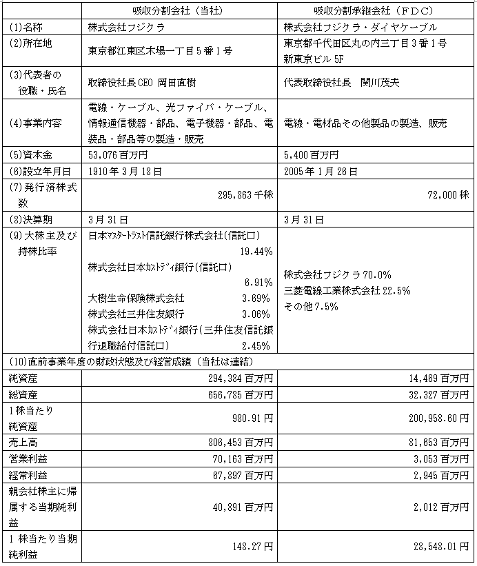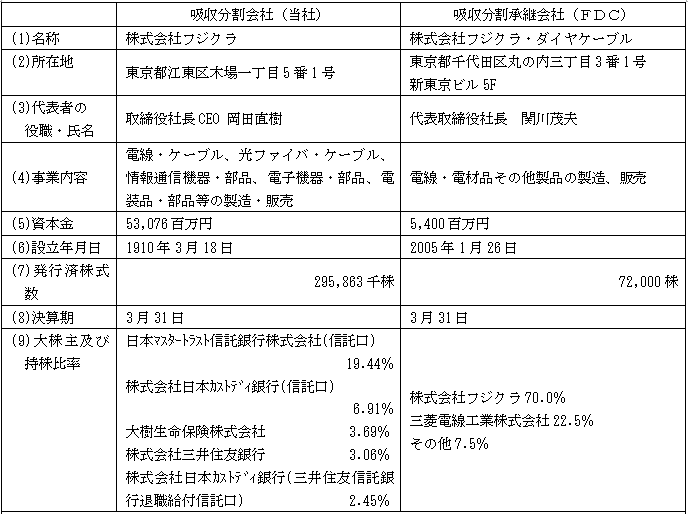 当社は、本日開催の取締役会において、現在当社が行っている導体事業(電気銅等の材料調達、銅荒引線及び銅線販売)(以下、「導体事業」といいます。)を当社の連結子会社である株式会社フジクラ・ダイヤケーブル(以下、「FDC」といいます。)に会社分割により承継する(以下、「本会社分割」といいます。)方針を決定いたしました。