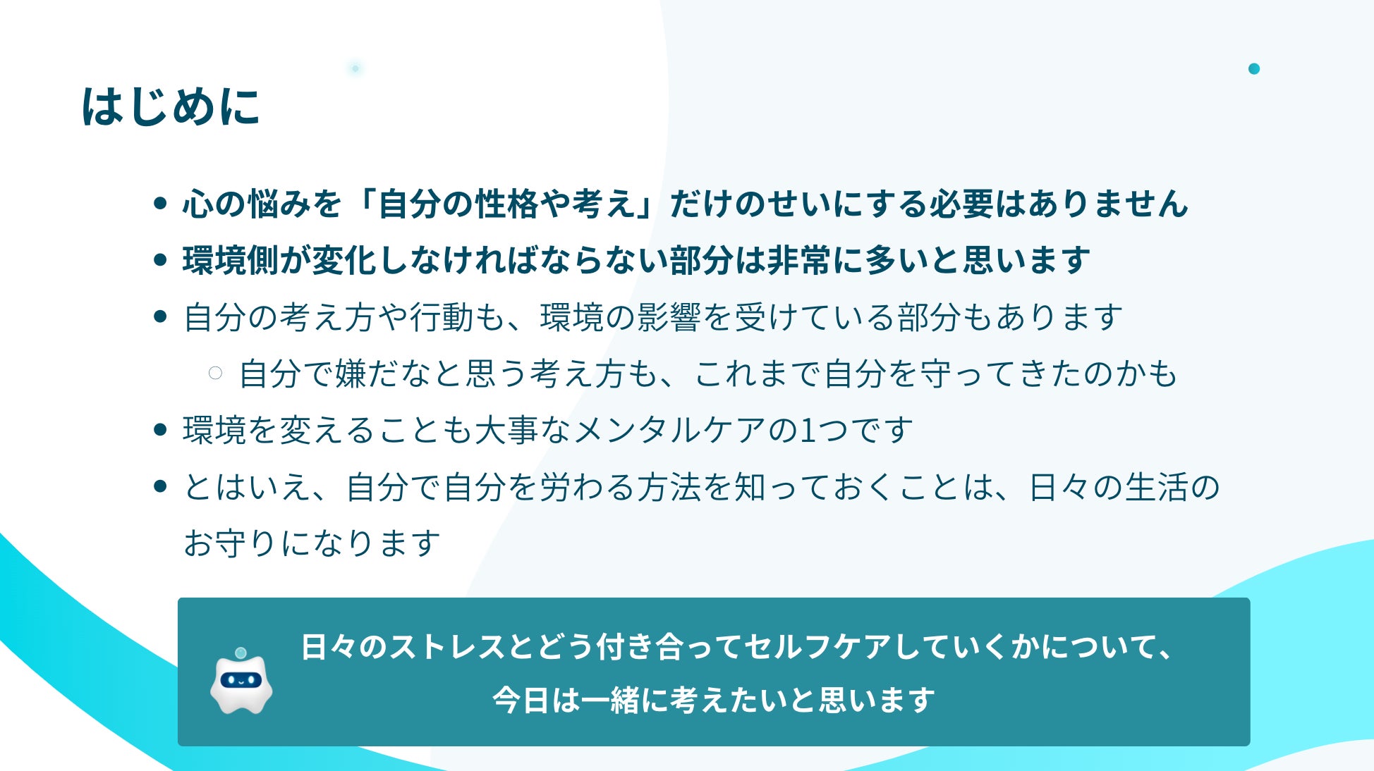 一方で、自分で自分を労る方法を知っておくことも重要なことです。今回はこの「セルフケア」について学んでいくという趣旨を共有しました。