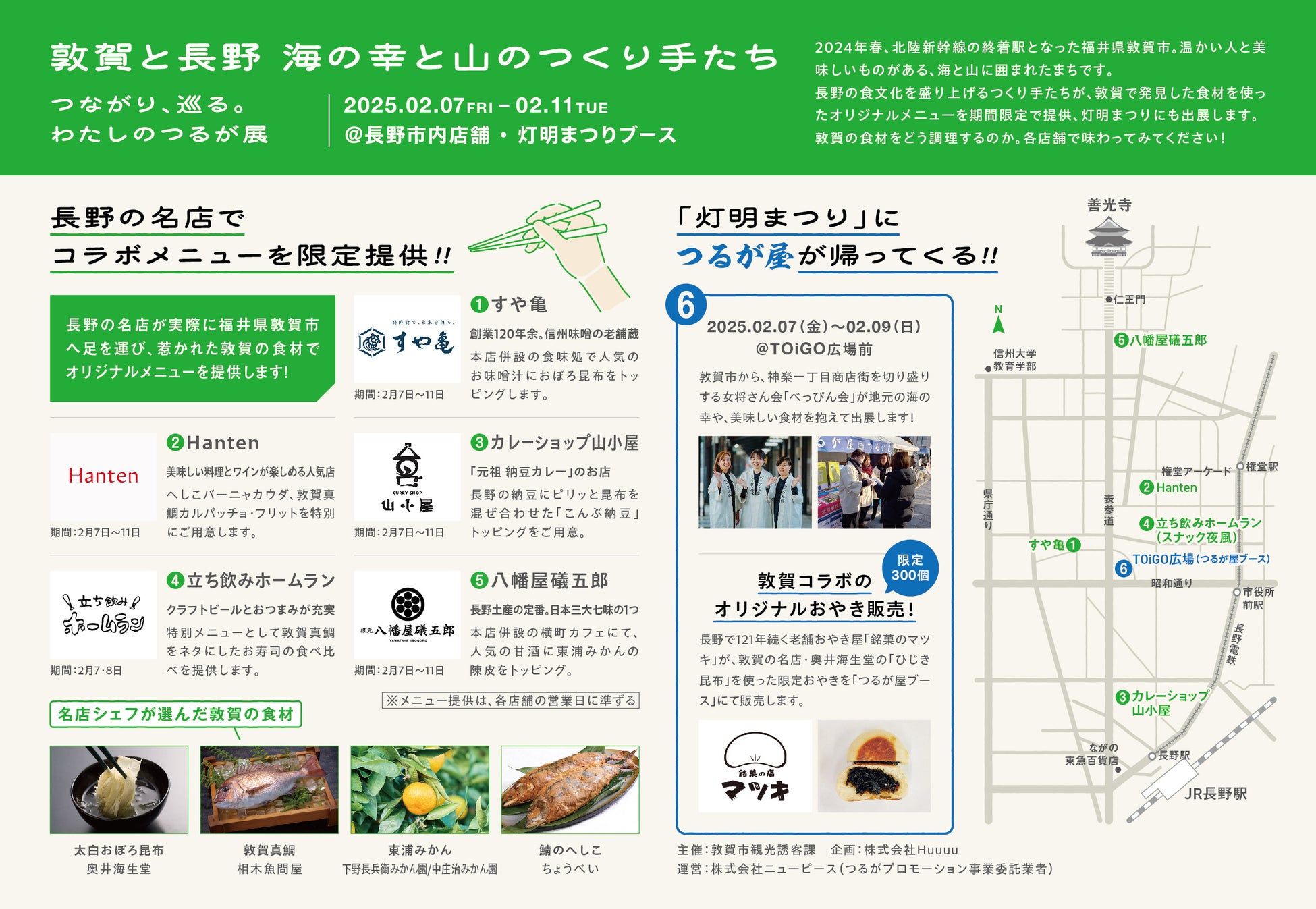 長野市内の人気飲食店5店舗による敦賀の特産品をつかったオリジナルメニュー提供に加え、善光寺までの参道で開催される灯明まつりへ「つるが屋」としてブース出展を行います。
