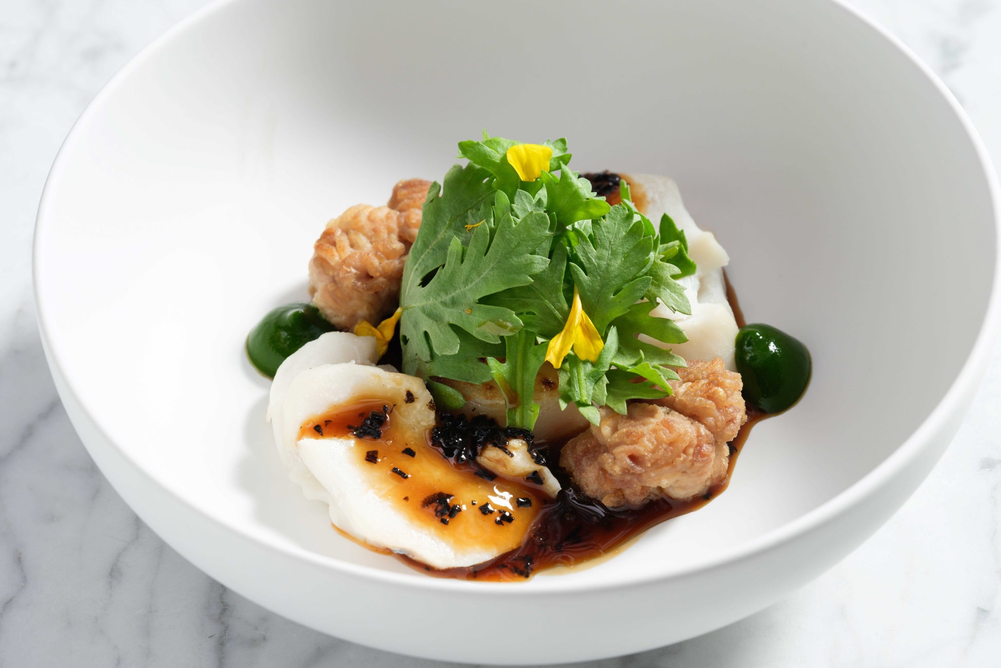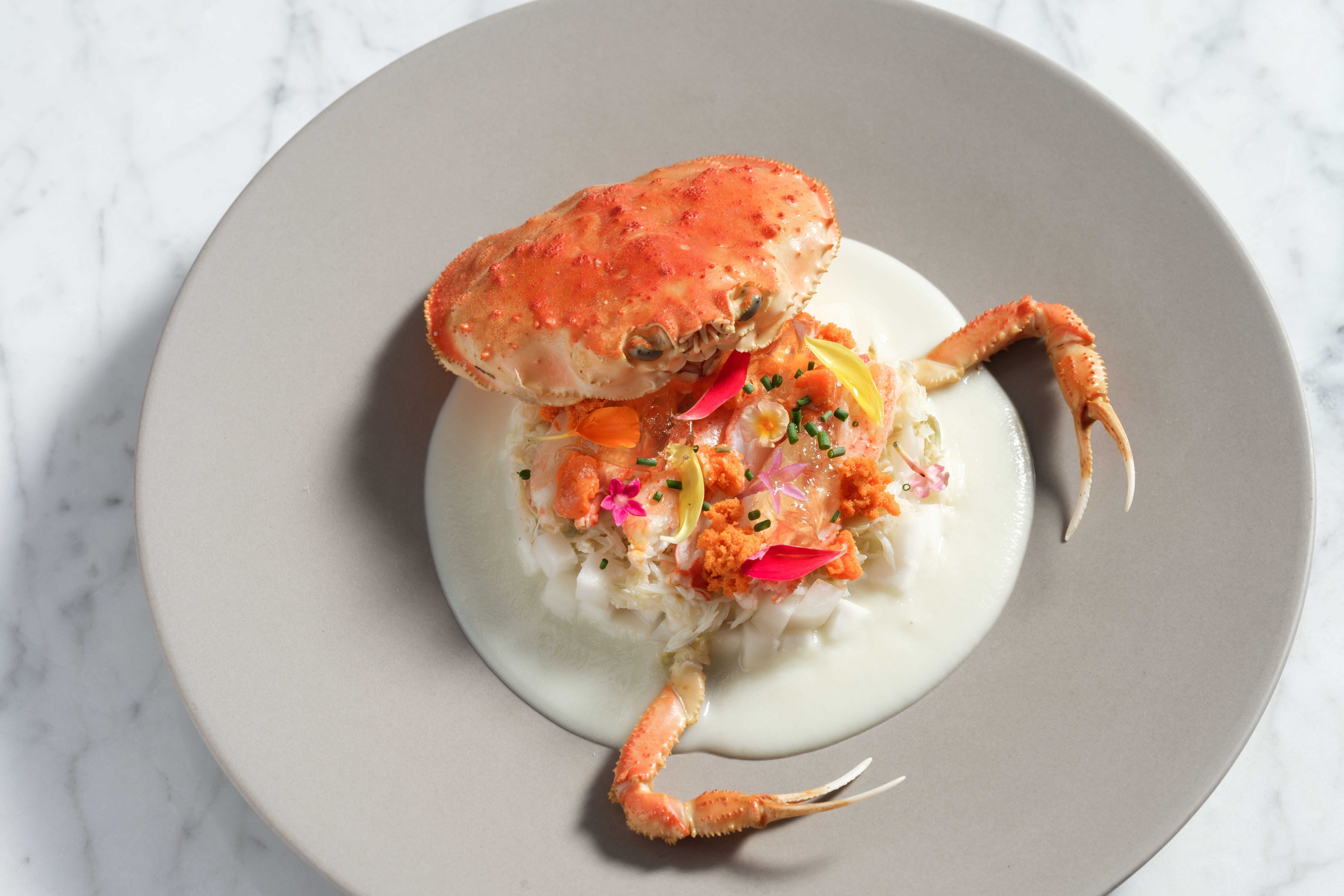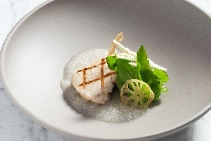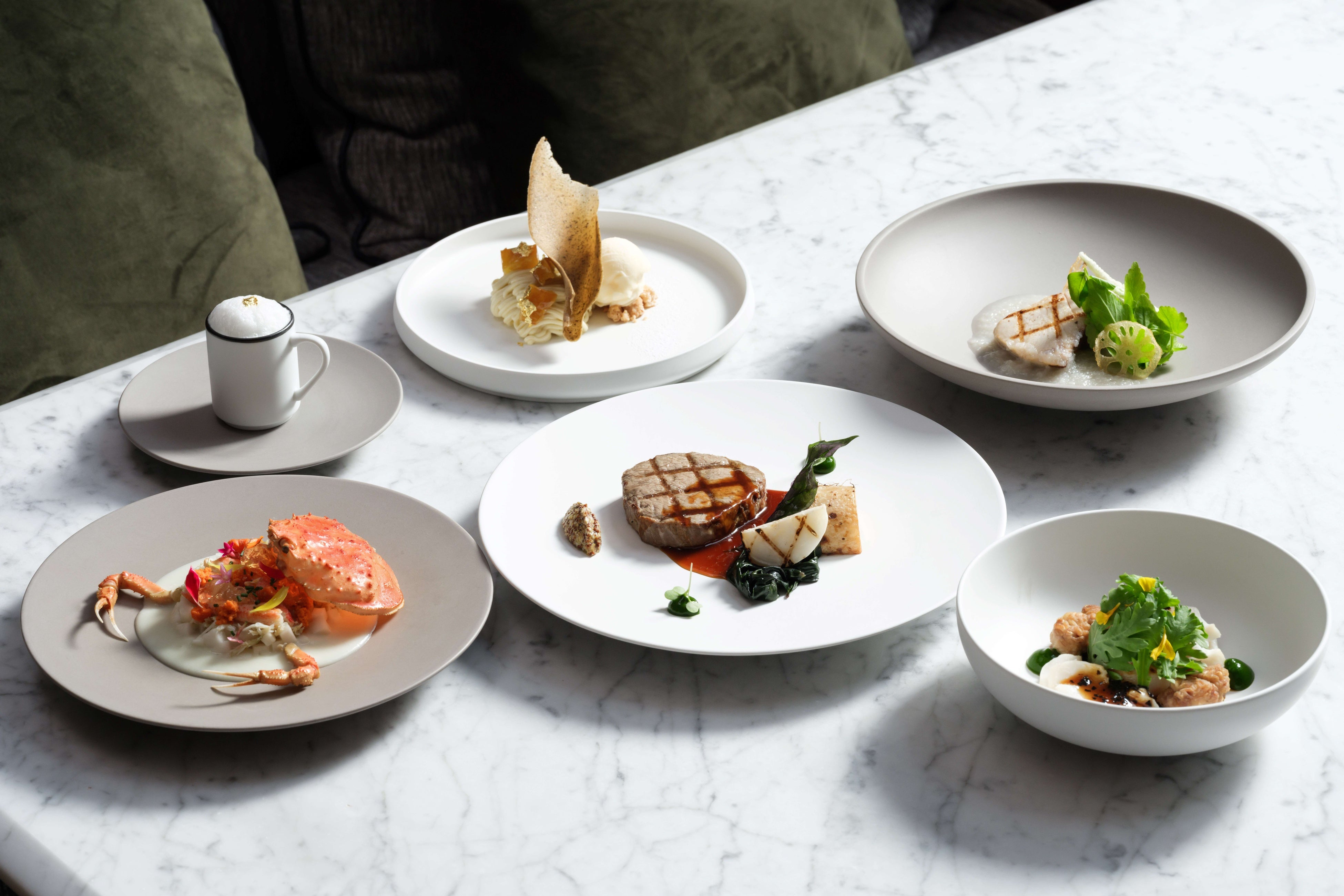 冬の金沢の代名詞でもある香箱ガニはサラダ仕立てとスープの2品で丸ごと1杯を満喫できる前菜に。繊細でコクのある蟹身、濃厚な内子とプチプチとした食感の外子の全てを贅沢に使い、蟹殻と爪も添え、ダイナミックな見た目もお楽しみいただける一品です。金沢港で水揚げされる鱈の白子には、やさしい香りの金沢春菊と深い甘みのある源助だいこんをあわせてお贈りします。オープンキッチンのグリルでじっくりと焼き上げた鰤は、加賀れんこんのガレットとすり流しとご一緒に、またメインディッシュの肉料理には金沢蕪、金沢一本太ねぎ、二塚からしな等をあしらい、食感の違いと味わいの変化をお楽しみいただけます。シェフの技が光るアレンジで、金沢産食材のクオリティと色彩、旨味を多角的に堪能できる至高のコースを、どうぞお見逃しなく。