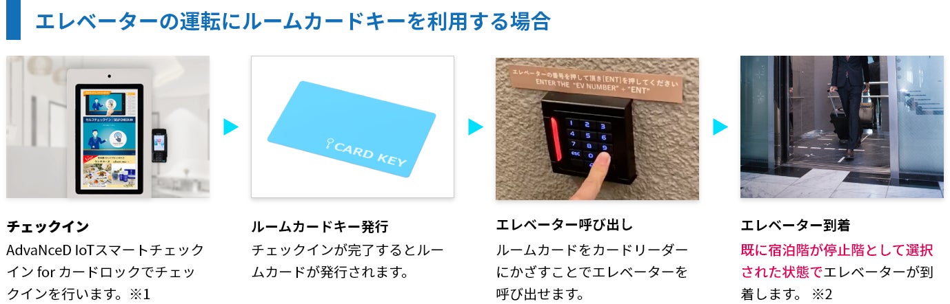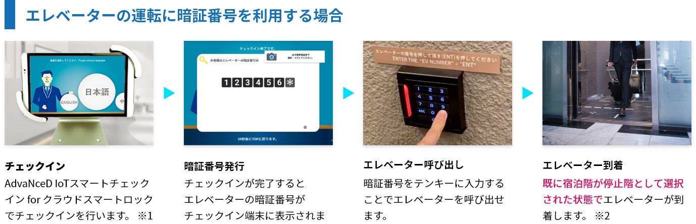 ※2 停止階をゲストの宿泊階のみに制限してエレベーターを自動運転するには、AdvaNceD IoTスマートチェックイン for クラウドスマートロックもしくはAdvaNceD IoTスマートチェックイン for カードロックとの連携が必要です。