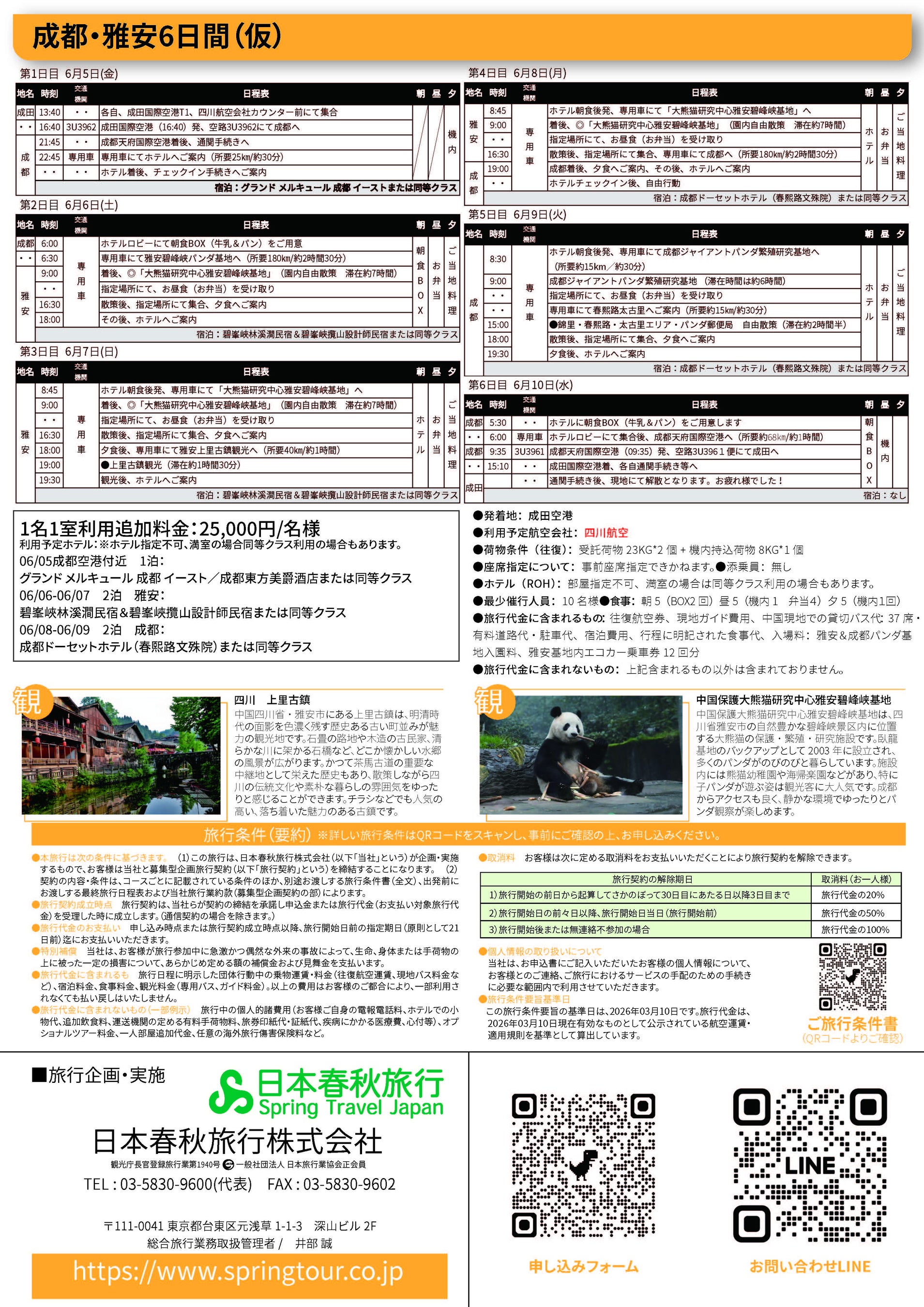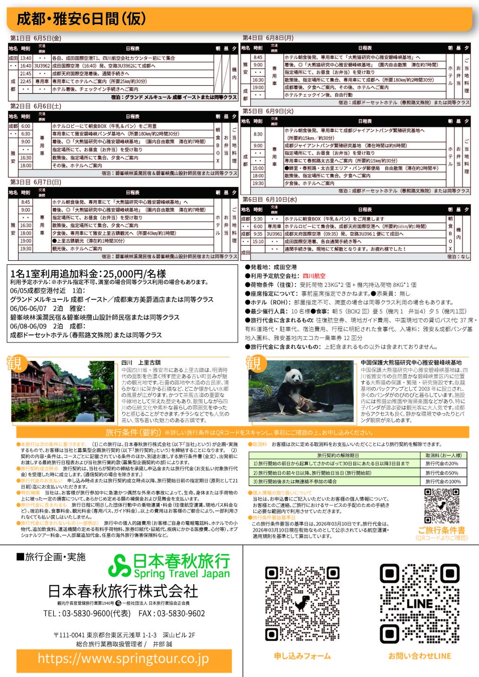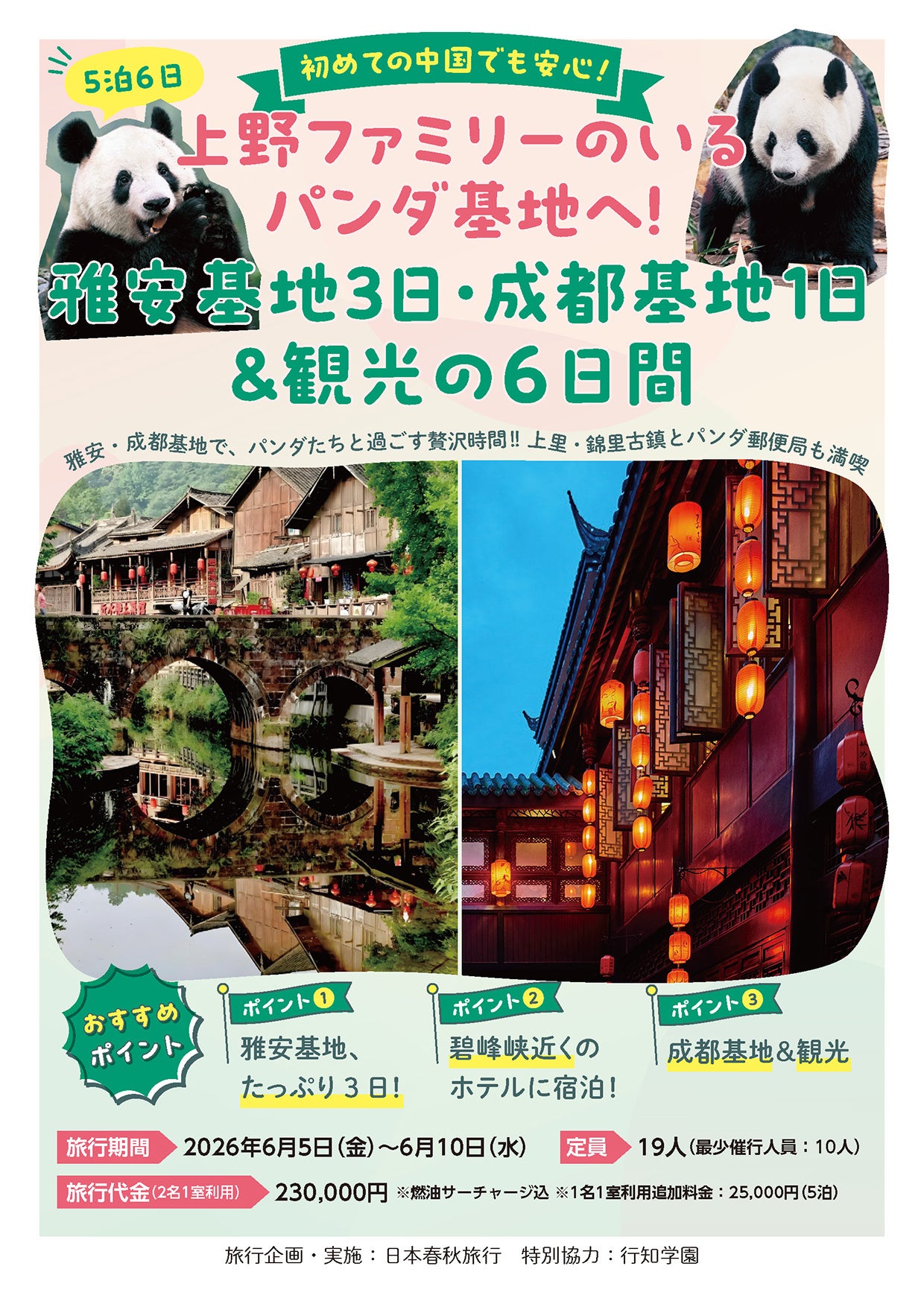 また、中国・四川省雅安市にある「中国大熊猫保護研究中心 雅安碧峰峡基地(通称:雅安パンダ基地)」などを訪れる団体旅行を、⽇本春秋旅⾏株式会社(本社:東京都台東区)との共同企画により実施いたします。