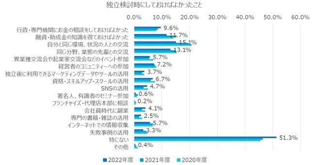◆独立検討時にしておけばよかったことは「行政・専門機関にお金の相談/自分と同じ状況の人との交流/融資・助成金の知識」など多岐にわたる