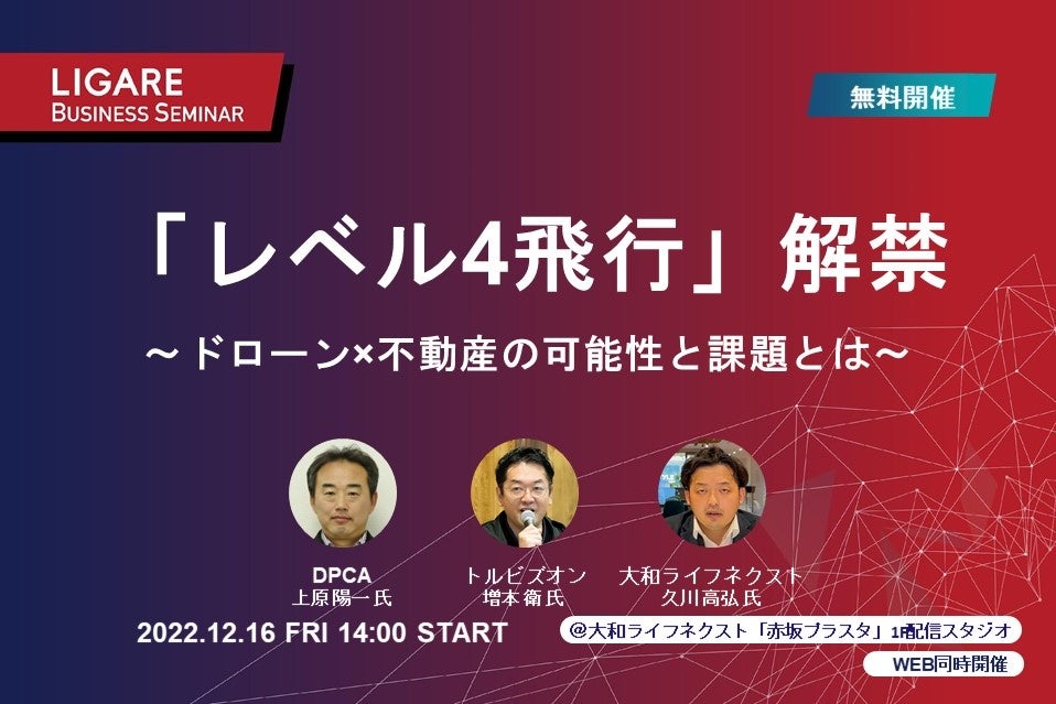 大和ハウスグループの大和ライフネクスト株式会社(本社:東京都港区、代表取締役社長:竹林 桂太朗)は、モビリティサービスの専門誌「LIGARE(リガーレ)」と共同で、無料セミナーイベント『レベル4飛行解禁 ~ドローン×不動産の可能性と課題とは~』を、配信スタジオを備えた情報発信プラットフォーム「赤坂プラスタ」にて2022年12月16日(金)に開催いたします。本セミナーでは、大和ライフネクスト株式会社、一般社団法人DPCA、株式会社トルビズオンが登壇いたします。