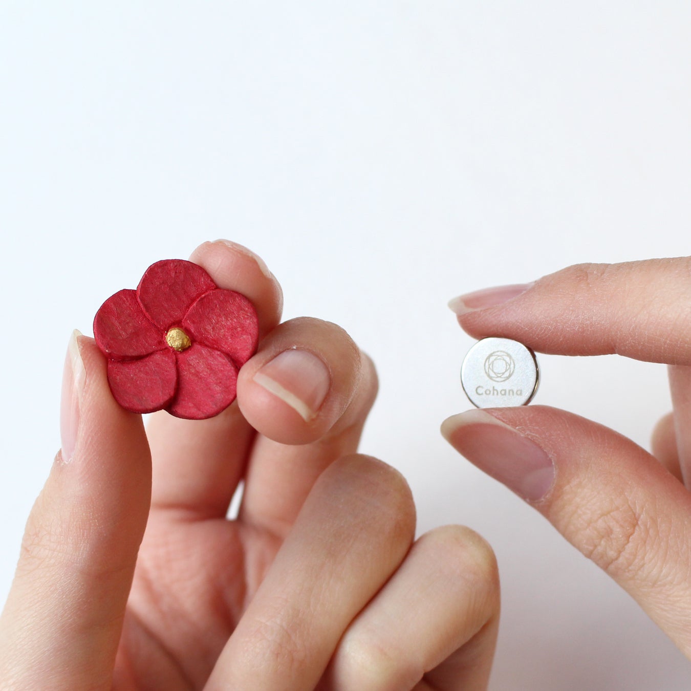 仏具の木彫り職人が、一つひとつ丁寧に削り出した梅の花。中に内蔵された磁石が、針をしっかりキャッチします。付属のもうひとつの磁石を使って、刺しゅう枠内の刺しゅう布の上に簡単に貼り付けられます。進行中の作品上の手元で針置きとして使用することで「針を置く」「針を取る」作業が安全でスムーズになります。