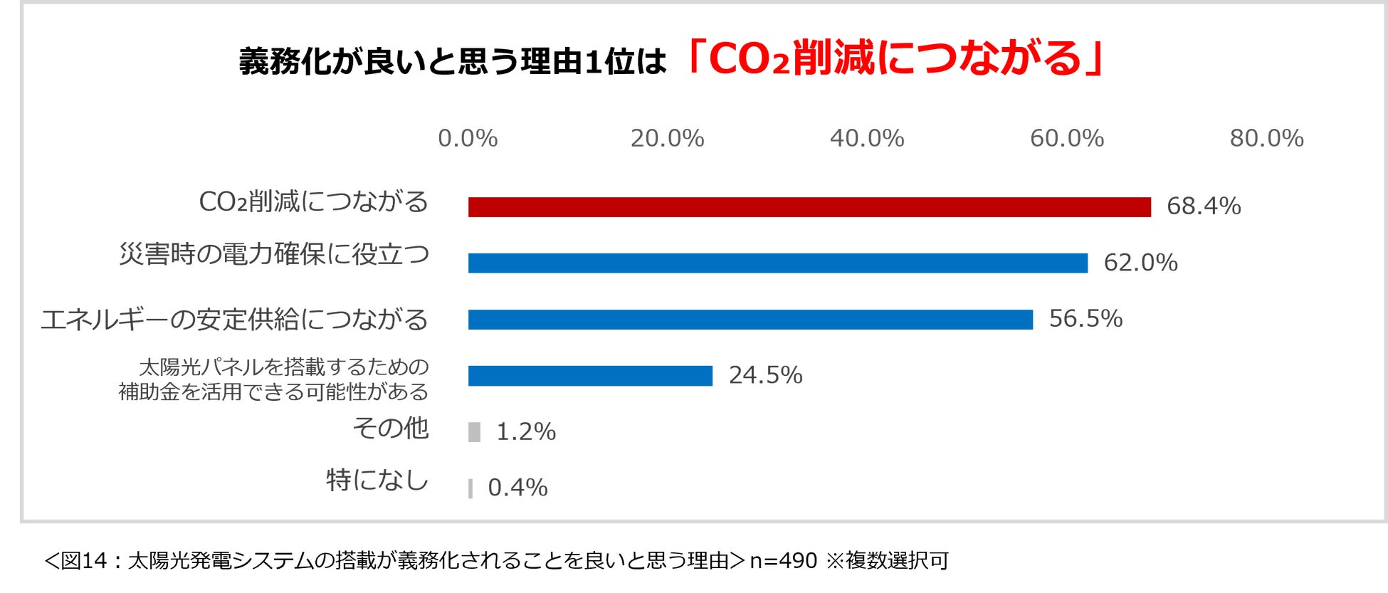 なお、太陽光発電システム設置の義務化について「良いと思う」と回答した490名に、その理由を尋ねたところ、「CO₂削減につながるから」という回答が最も多く68.4%という結果になりました。(図14)